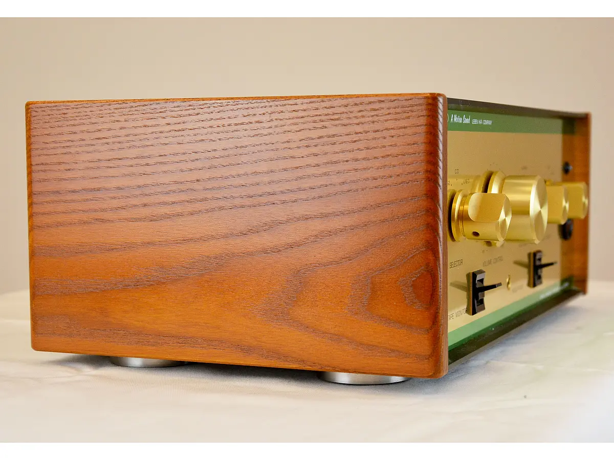 Its appearance clearly recalls the tradition of classic Japanese high-fidelity design, featuring gold anodized aluminum front and rear panels, large control knobs and Canadian ash side panels, a durable wood also used in the production of baseball bats. The toggle switches and power switch further enhance the vintage character, giving the amplifier an elegant and timeless presence.