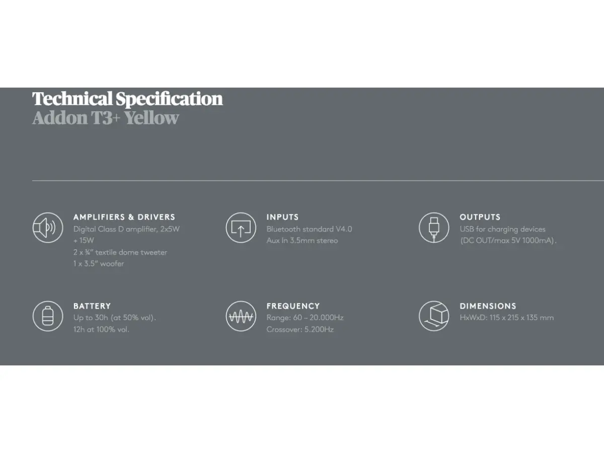 Addon T3+ is designed to be used for a long time. The battery lasts a full 30 hours at half volume. And 12 hours at maximum volume!