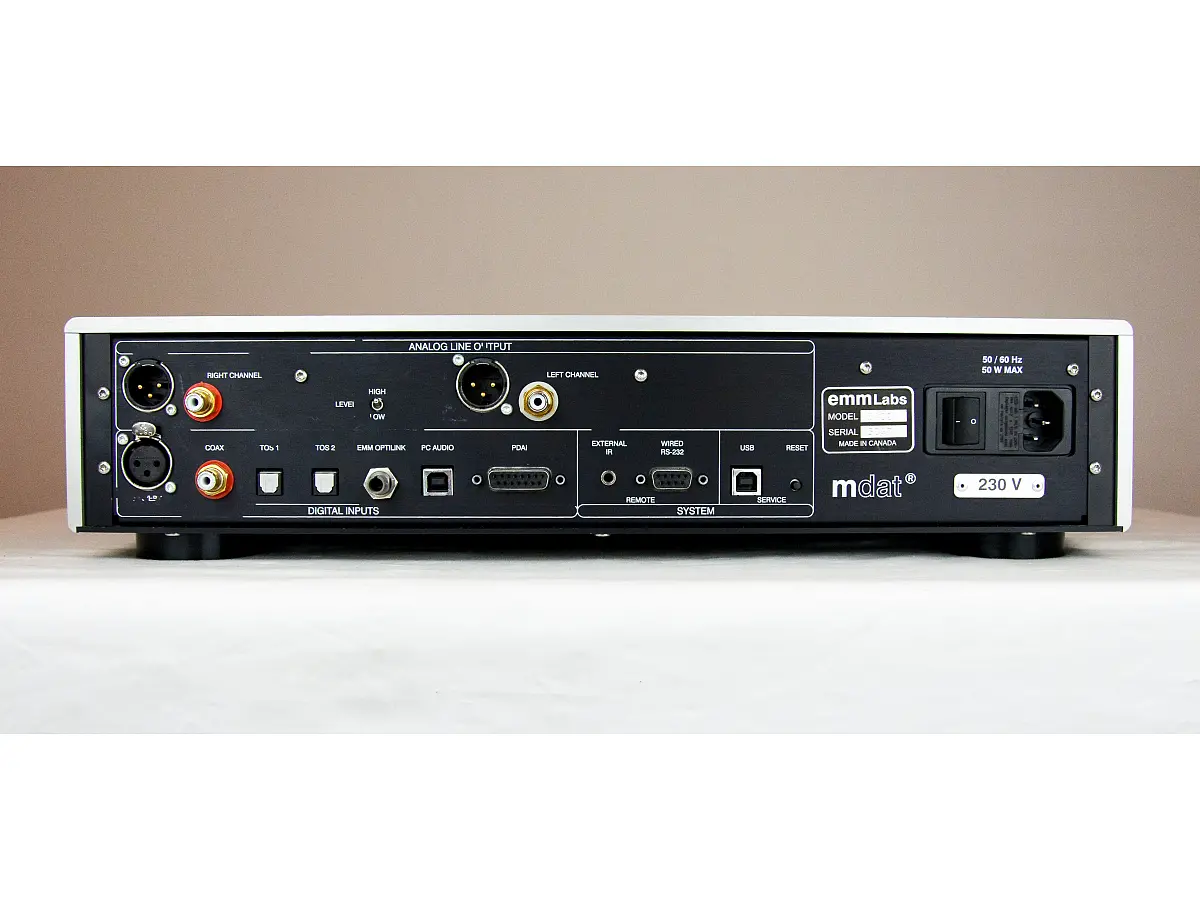 - Digital input formats: EMM OptiLink for direct connection with the EMM Labs TSD1 transport; AES (XLR); SP/DIF (RCA); TOSLink; PDAI Interface