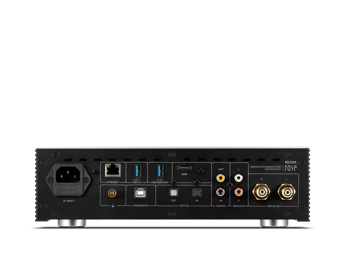 The RoseAudioServer platform, developed in-house by HiFi ROSE, manages audio data flow in a process completely separated from other system activities, ensuring that the signal reaches the DAC in its purest form, unaffected by background processes or user interactions. This advanced architecture enables stable and consistent playback even with ultra-high-resolution files and very large music libraries. Thanks to extensive wired and wireless connectivity—including Ethernet, Wi-Fi, Bluetooth, optical and coaxial inputs and outputs, USB Audio output for external DACs, analog pre-out, line input, and HDMI output—the ROSE RS250A stands as a true multimedia control center, combining reference-grade audio quality, 4K video performance, and maximum operational flexibility in a single elegant and technologically advanced device.