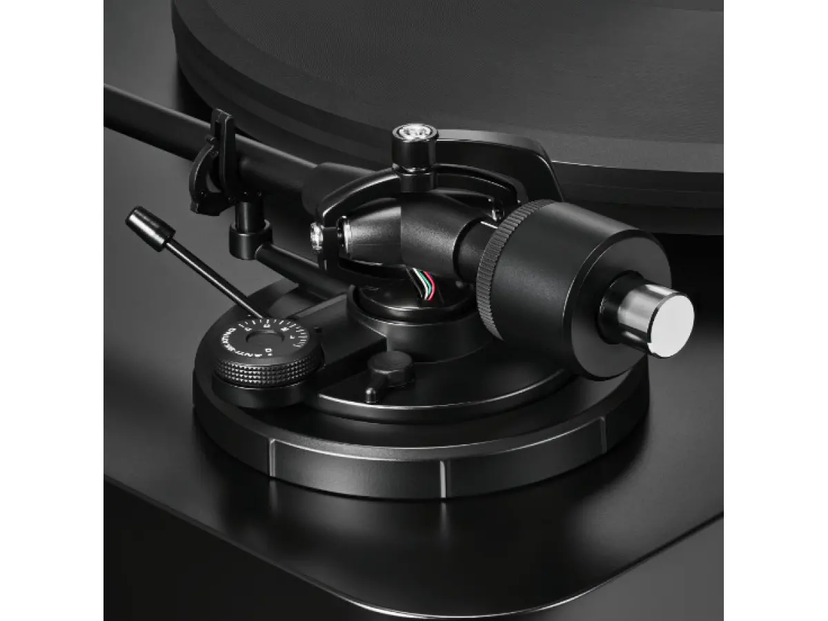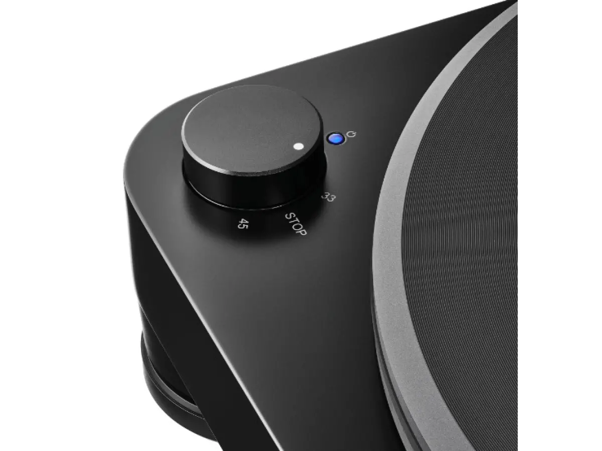 The motor, monitored by an optical sensor, maintains consistent platter rotation at 33-1/3 or 45 RPM, while its mounting on rubber bushings reduces vibration transmission to the chassis. The external power supply isolates AC-to-DC conversion, eliminating electrical interference, and the spring-isolated adjustable feet protect the turntable from external disturbances. The combination of the high-density acrylic platter, stainless steel spindle with thermoplastic bearing, and optimized chassis geometry ensures smooth and quiet rotation, bringing out the brilliance and detail of vinyl records.