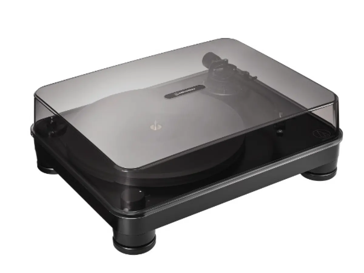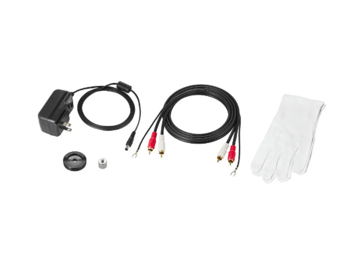 - Included accessories: dust cover; platter; drive belt; counterweight; light sub-counterweight; AT-LT10 headshell with AT-VM95E BK stereo cartridge; 45 RPM adapter; RCA audio cable (~1.4 m); AC adapter (~1.3 m); gloves
