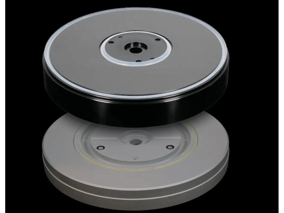 The platter assembly adopts a dual-platter design with an inner sub-platter and an outer platter, both precision-machined from A5056 aluminum alloy. With a total weight of approximately seven kilograms, the system provides sufficient inertia for smooth and stable rotation. The outer platter surface is black anodized with a glossy hairline finish, creating an elegant contrast with the natural aluminum plinth. A tapered spindle helps absorb any wobble caused by off-center records, while an extremely thin layer of anti-vibration material protects the vinyl and improves coupling.