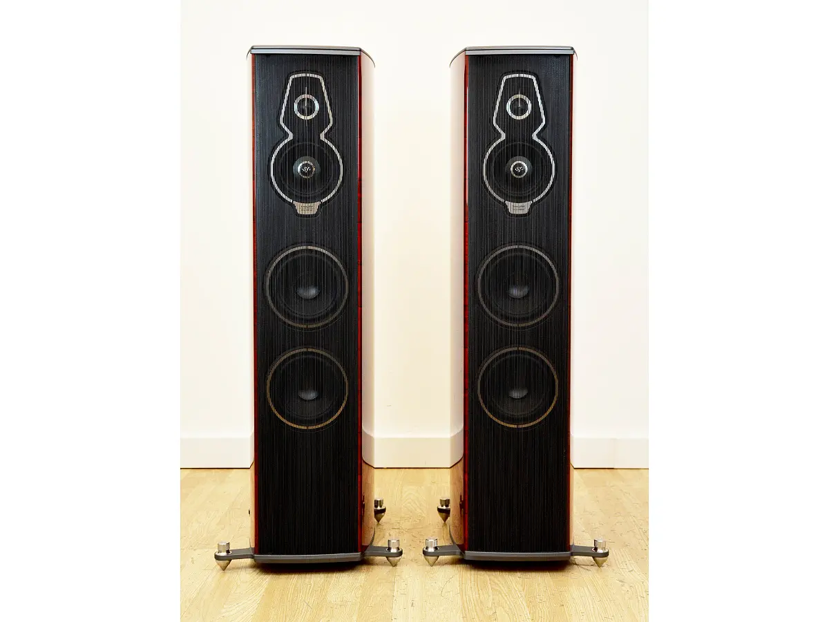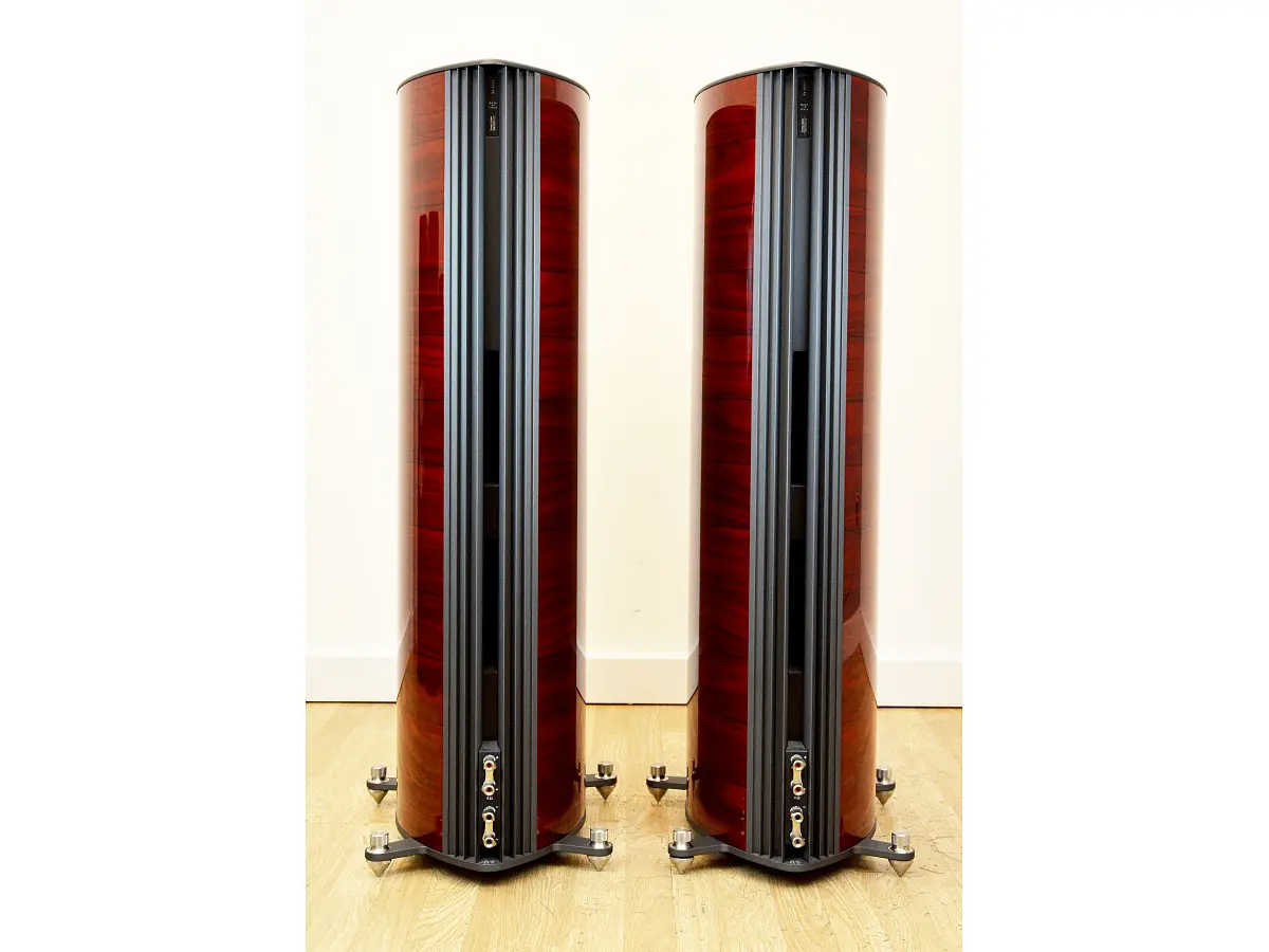 Each Serafino G2 is crafted at the Vicenza facility, where the skill of master artisans meets the precision of modern engineering. The result is a loudspeaker that transcends its technical function to become a true work of art: the lute-shaped cabinet, hand-stitched black leather, and satin aluminum details reflect the excellence of Italian design, while the lacquered red wood finish enhances its visual presence with timeless elegance.