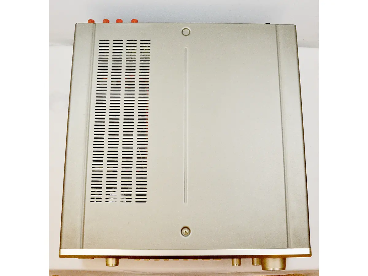 La sezione di amplificazione utilizza cinque stadi indipendenti, ciascuno con due transistor di potenza Hitachi in configurazione push-pull, raffreddati da ventole silenziose che entrano in funzione solo quando necessario. L’alimentazione principale è un trasformatore massiccio montato su supporto smorzante, mentre un’alimentazione secondaria indipendente gestisce i circuiti logici, garantendo separazione totale tra segnali audio e controlli elettronici. Questa architettura assicura che anche con altoparlanti ad alta efficienza o carichi impegnativi l’amplificatore mantenga controllo, precisione e assenza di distorsioni.