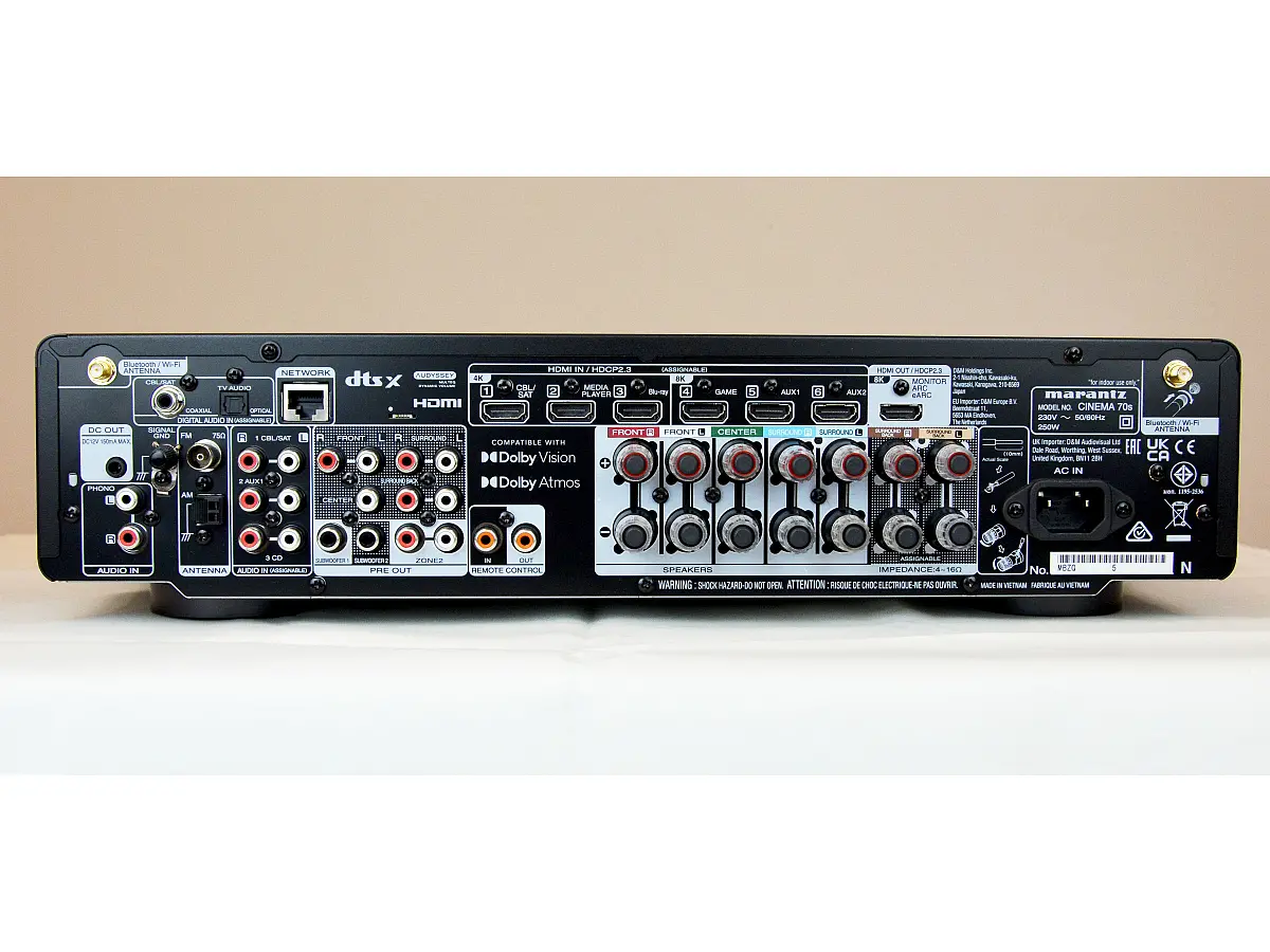 Il CINEMA 70s combina quindi compattezza, tecnologia all’avanguardia e qualità sonora tipica di Marantz, offrendo un’esperienza di intrattenimento completa, sia per la riproduzione musicale che per il cinema in casa, con un suono caldo, dinamico e ricco di dettagli, perfetto per chi desidera prestazioni elevate senza rinunciare a eleganza e praticità.
