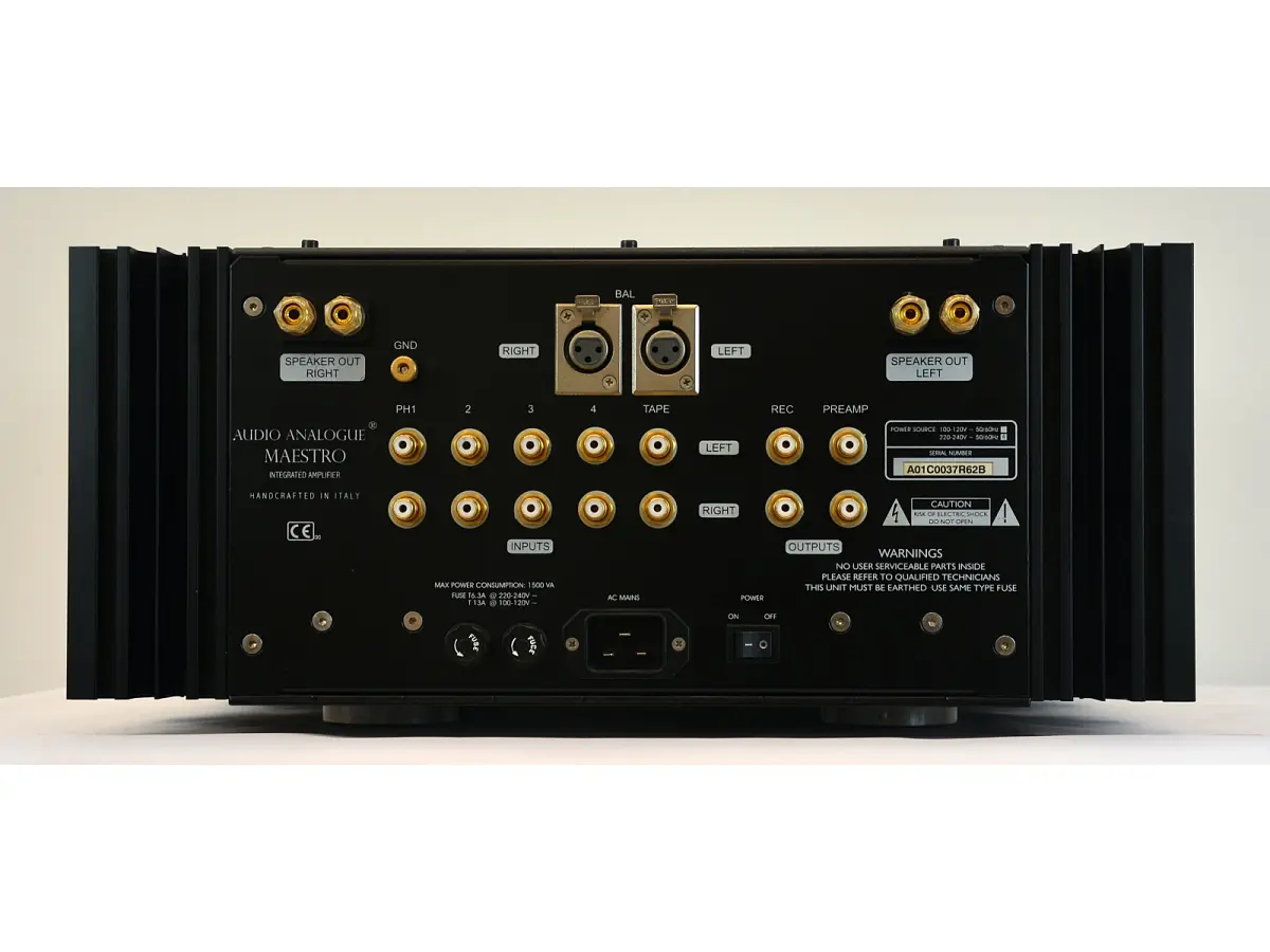 L’Audio Analogue Maestro è un amplificatore integrato di dimensioni imponenti, massiccio e vistoso, capace di catturare immediatamente l’attenzione grazie alla gigantesca manopola del volume collocata al centro del pannello frontale. La sua presenza scenica è dominante e difficilmente lascia indifferenti, complice anche un peso che raggiunge i 52 kg, caratteristica che ne condiziona in modo significativo il posizionamento e la gestione all’interno dell’ambiente domestico.