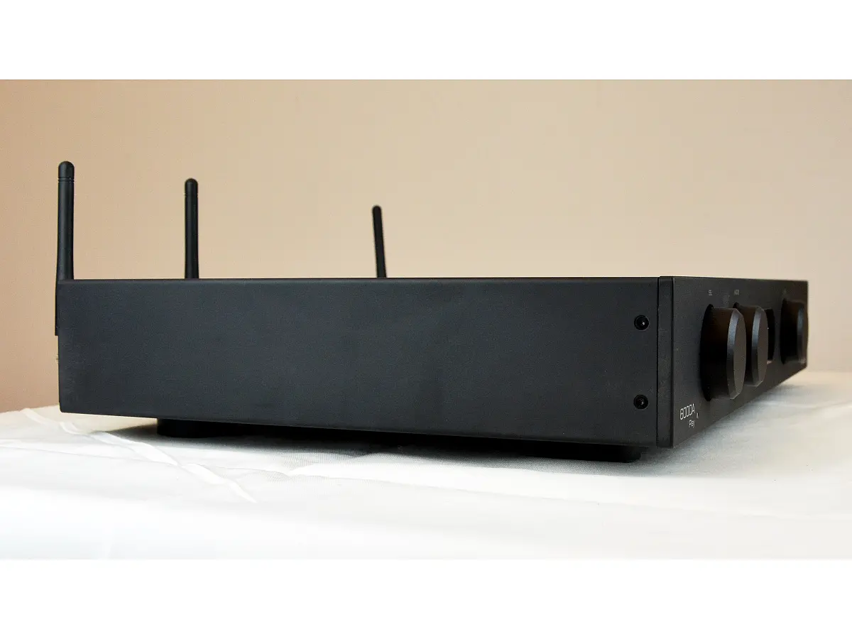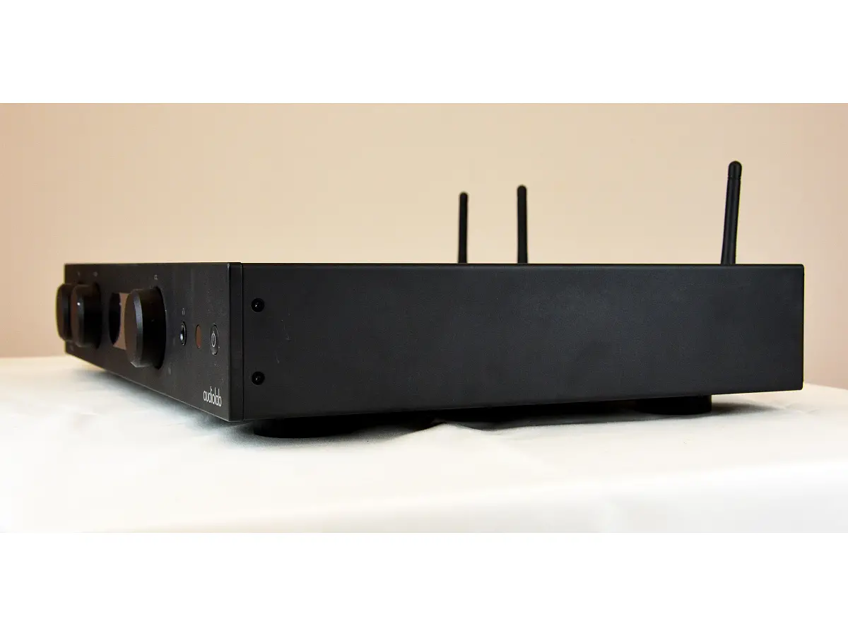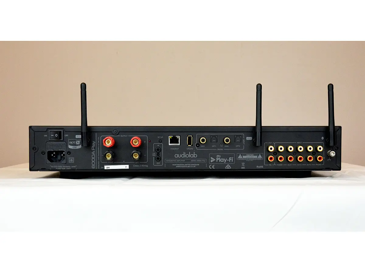 L’Audiolab 6000A Play conserva la raffinata circuiteria del 6000A, progettata da Jan Ertner, che ha perfezionato l’esperienza acquisita con il precedente modello 8300A. Il DAC integrato è un ES9018 Sabre32 con architettura HyperStream a 32 bit e sistema di eliminazione del jitter Time Domain Jitter Eliminator. Sono presenti quattro ingressi digitali – due coassiali e due ottici – che supportano segnali fino a 24bit/192kHz, con filtri selezionabili dall’utente (Fast Roll-Off, Slow Roll-Off e Minimum Phase). La connettività wireless è ampliata dal Bluetooth con codec aptX per uno streaming di qualità.
