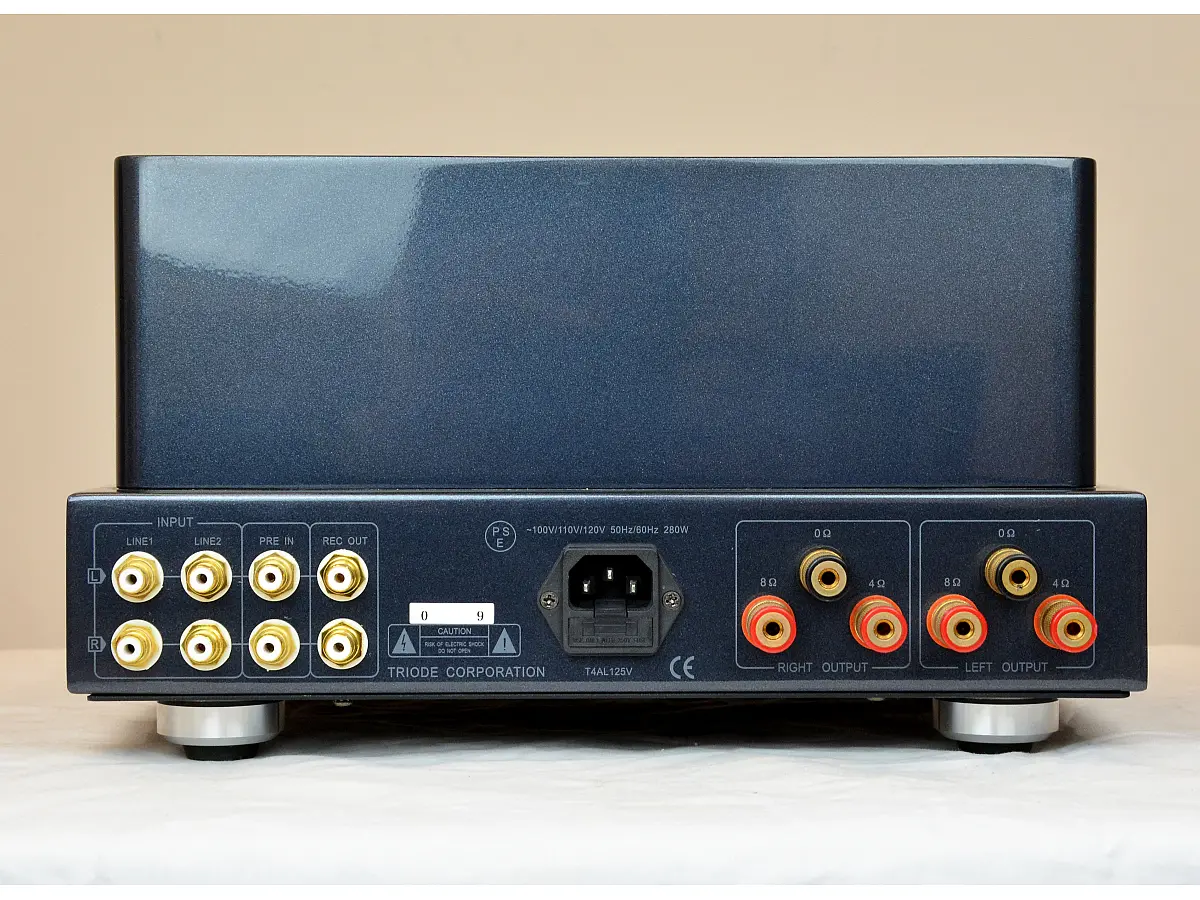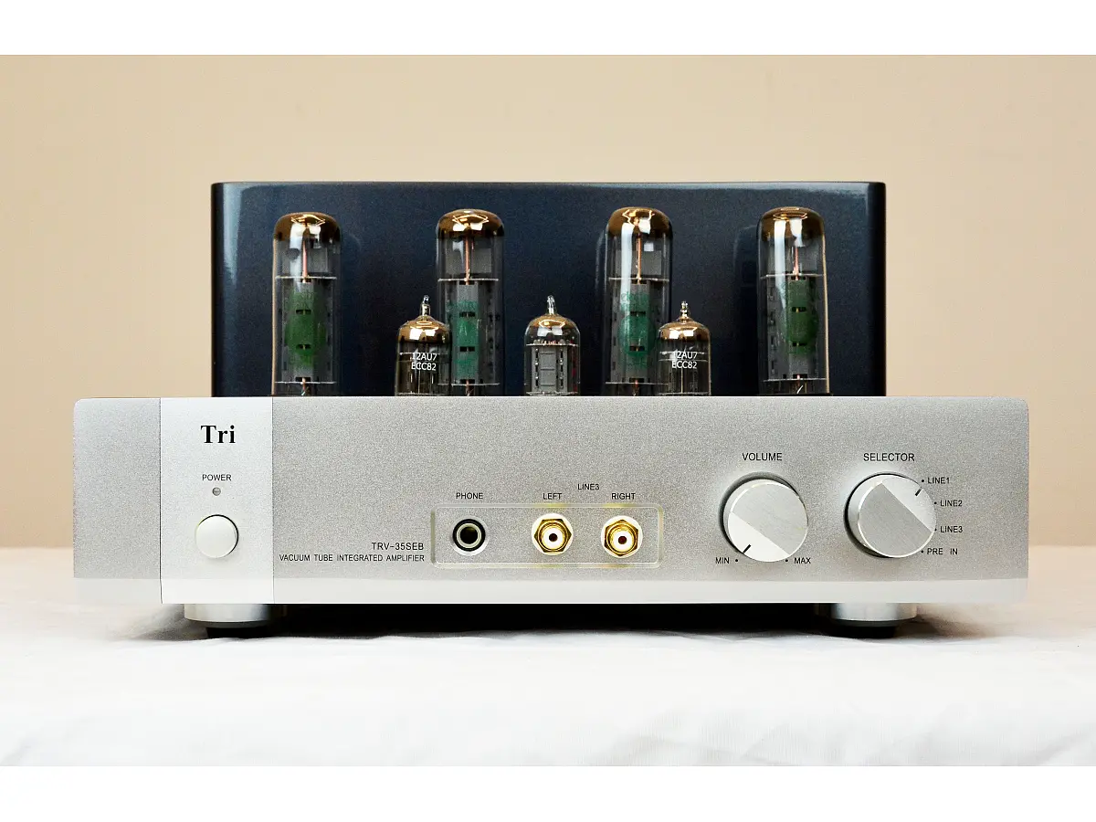 Il TRV‑35SE dispone di un circuito push-pull in Classe AB, con alimentazione separata per canale e stadio preamplificatore realizzato con tecnologia point-to-point, a testimonianza della cura costruttiva tipica del marchio Triode. La risposta in frequenza si estende da 10 Hz a 100 kHz (±4 dB), la distorsione armonica totale è inferiore allo 0,1% a 1 kHz e il rapporto segnale/rumore raggiunge circa 90 dB. L’impedenza d’ingresso è di 100 kΩ con sensibilità di 0,4 V, mentre le uscite per diffusori sono disponibili per 6 e 8 ohm; sono presenti inoltre più ingressi RCA, incluso un ingresso frontale, e un’uscita per cuffia.