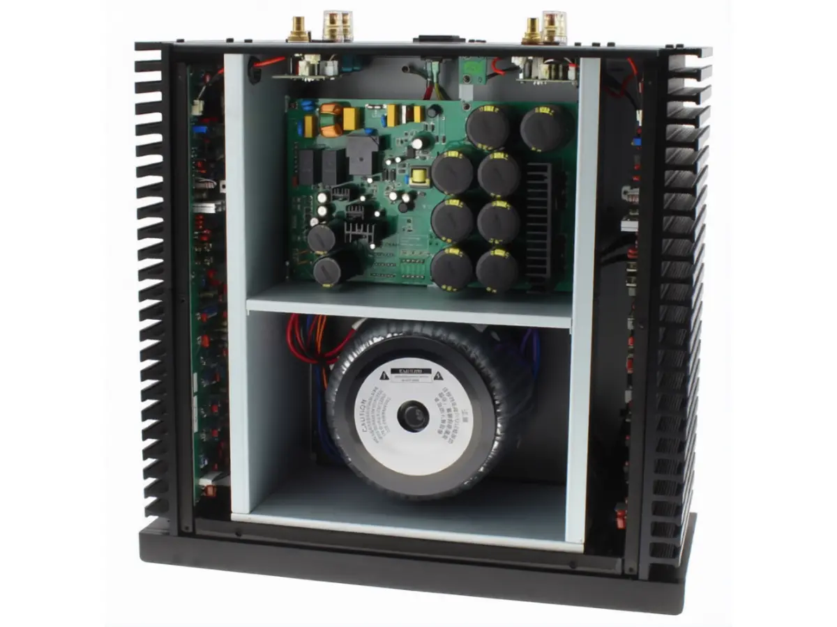 La sezione di amplificazione utilizza otto coppie di transistor ad alta potenza NJW0281G e NJW0302G prodotti da onsemi, componenti apprezzati per la loro affidabilità anche in condizioni di forte variazione di corrente, capaci di mantenere costante la qualità sonora su tutta la gamma di frequenze, restituendo un suono ricco, analitico e piacevole, apprezzato da audiofili e professionisti del settore.