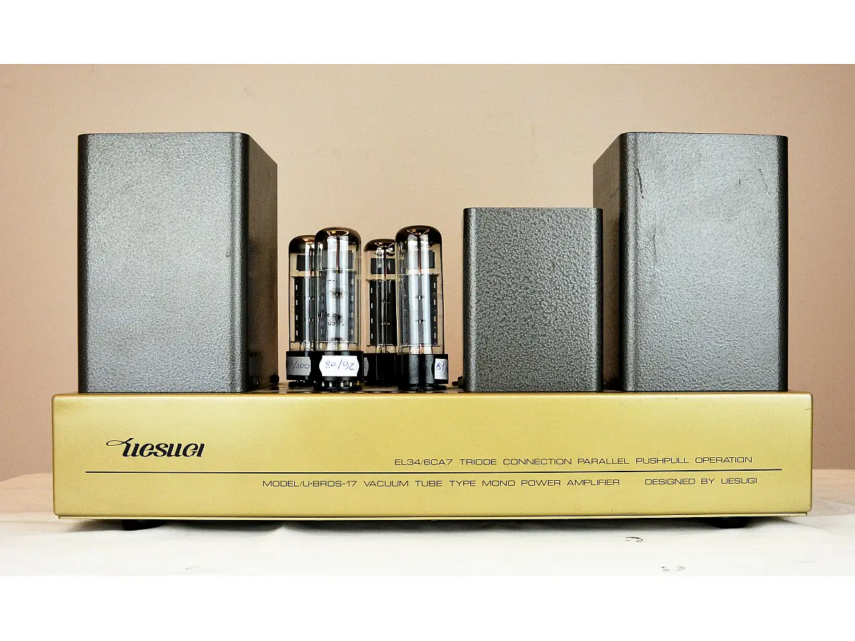 Il finale monofonico U-BROS-17 rappresenta l’evoluzione e il perfezionamento del modello U-BROS-11. La progettazione dell’amplificatore parte da uno stadio iniziale costituito dalla connessione in parallelo di valvole ECC83/12AX7, mentre lo stadio di ingresso e quello di inversione di fase adottano un collegamento a catodo con valvole ECC82/12AU7. Lo stadio di potenza utilizza valvole EL34/6CA7 in configurazione push-pull parallela a tre poli, attentamente selezionate in coppie abbinate con lo stesso valore di corrente, dopo un lungo processo di “invecchiamento” tramite un’apposita macchina sviluppata dal laboratorio di ricerca Uesugi, eliminando così la necessità del circuito di bilanciamento DC.