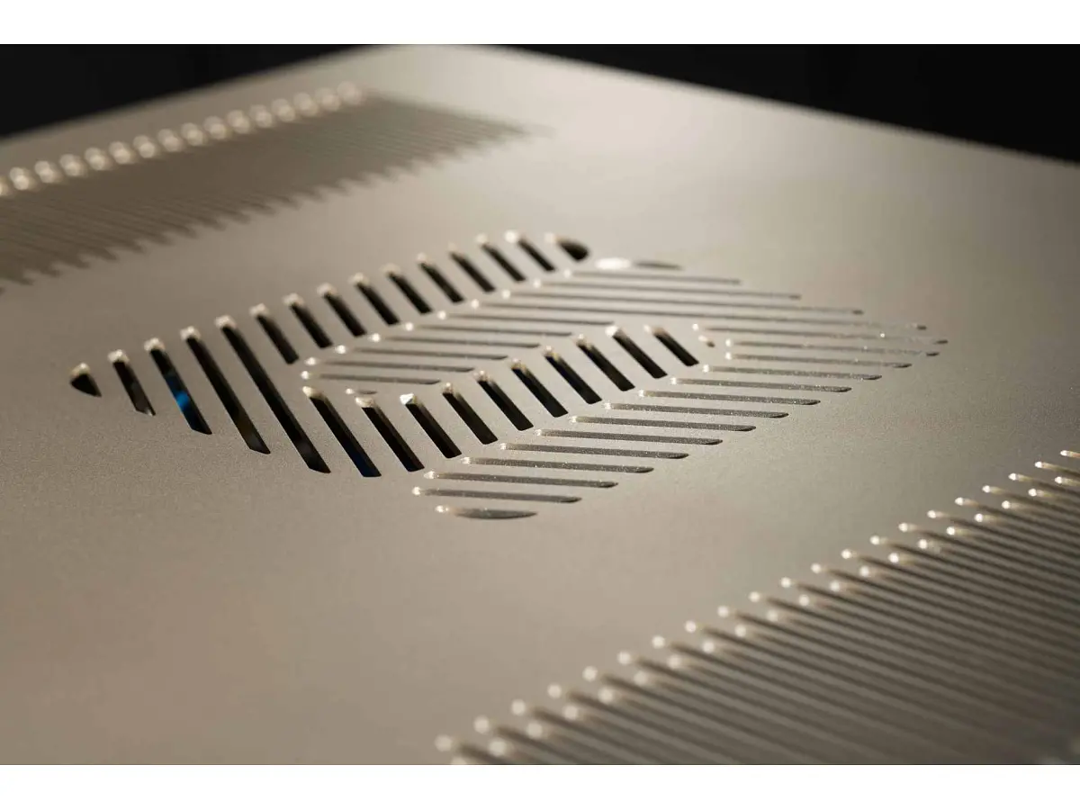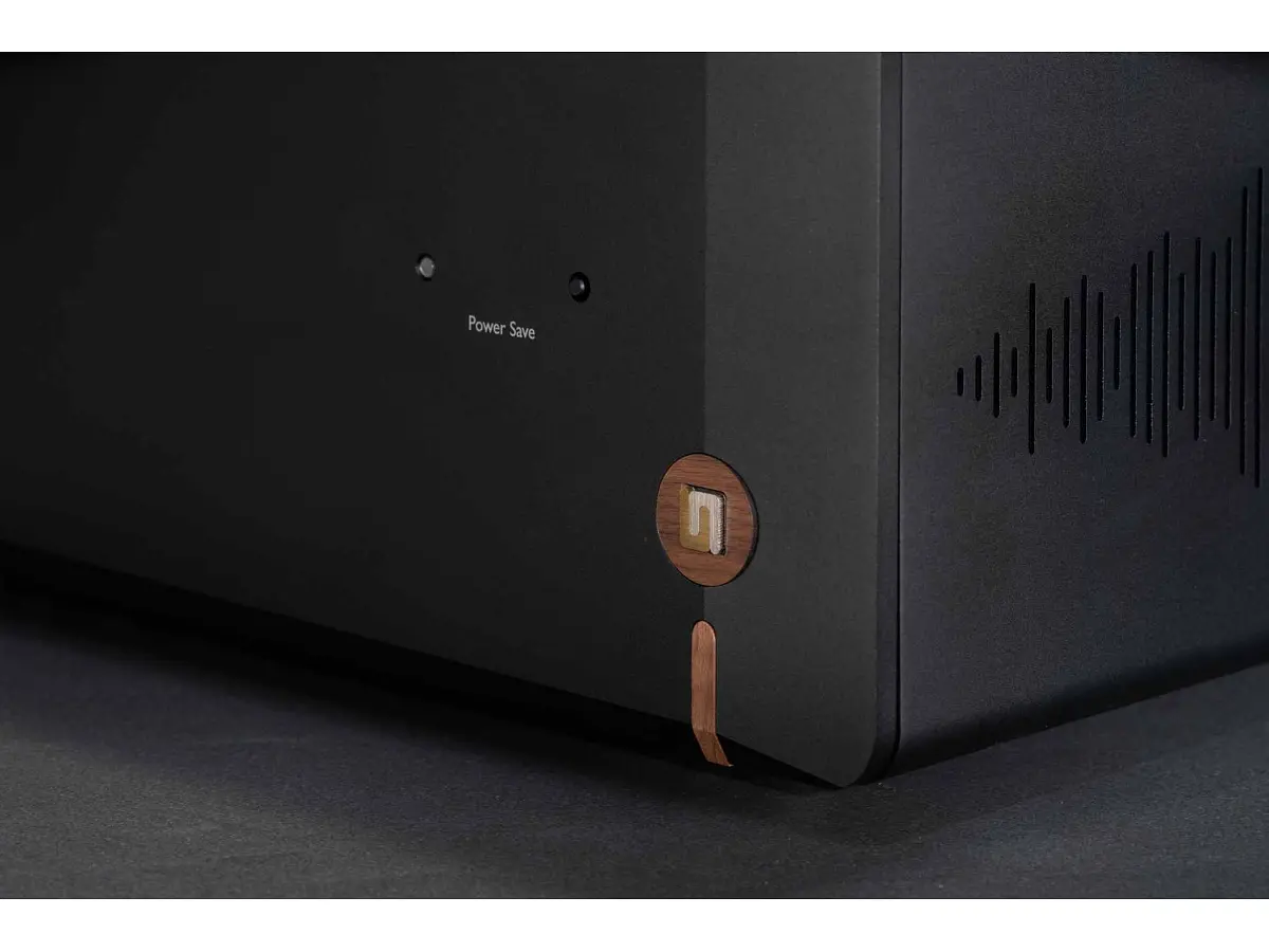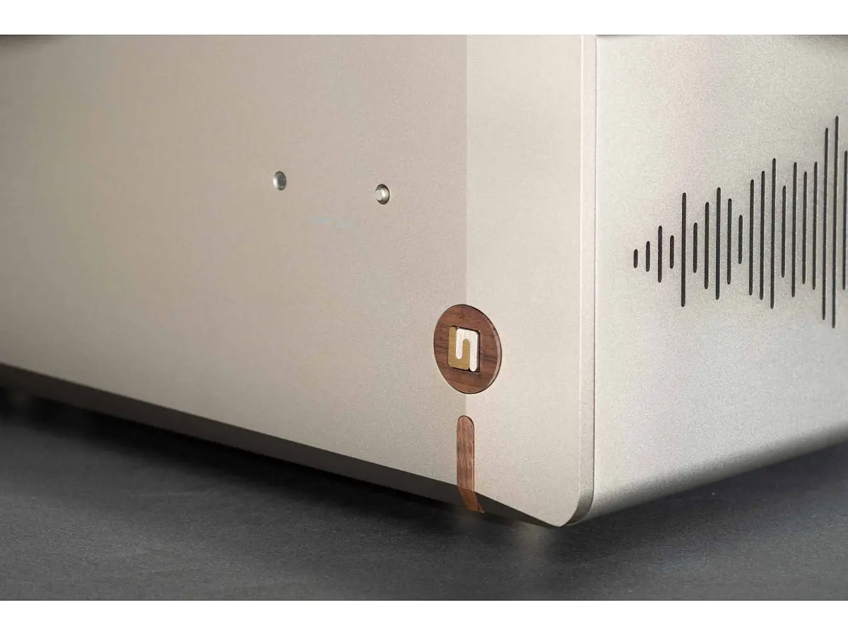 Il pannello frontale, ricavato dal pieno in alluminio da 15 mm di spessore, trasmette solidità e precisione costruttiva. Le finiture Midnight Black e Velvet Gold esaltano ogni particolare del design, mentre la superficie, curata nei minimi dettagli, risulta piacevole sia al tatto sia alla vista. Il coperchio in alluminio da 2 mm avvolge l’intero amplificatore, conferendo una sensazione di robustezza e continuità estetica, mentre gli inserti in legno richiamano il logo storico Unico, sottolineando il legame con la tradizione del marchio. Il logo Unison Research® diventa parte integrante del design trasformandosi nel tasto di accensione On/Off, un elemento distintivo che unisce funzionalità e identità.