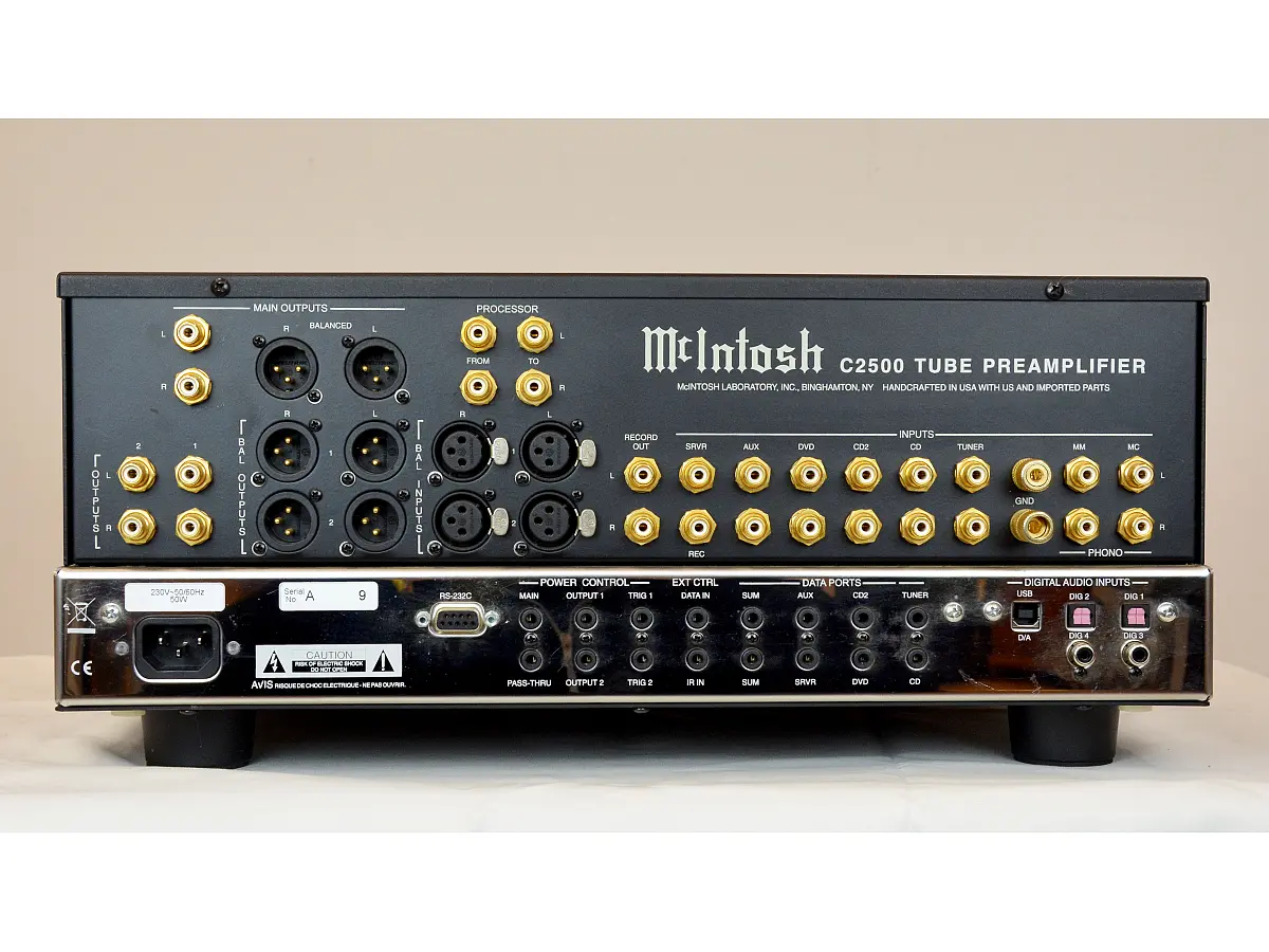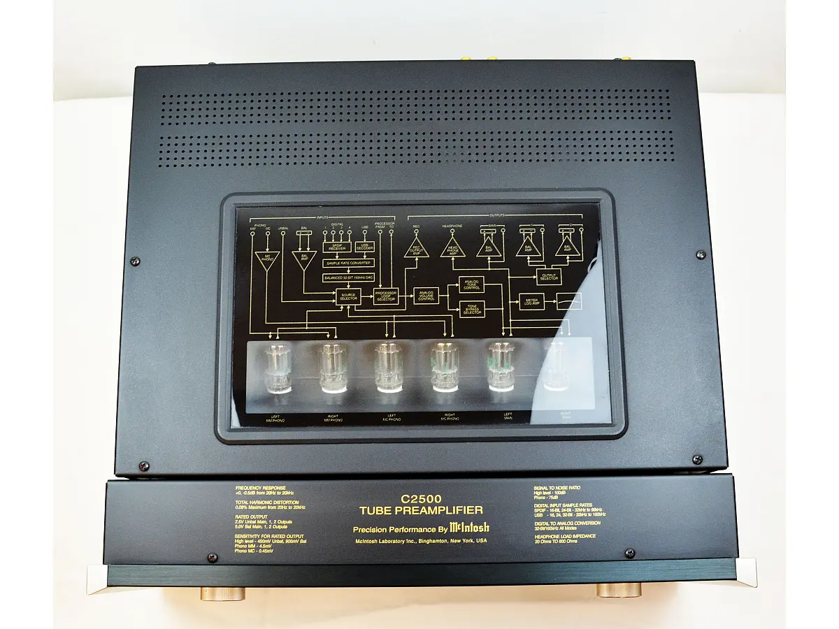 Il McIntosh C2500 rappresenta l’incontro perfetto tra la tradizione dei preamplificatori a valvole e le esigenze tecnologiche moderne. Il cuore analogico si basa su sei tubi dual triode 12AX7, capaci di offrire una preamplificazione di altissimo livello, conferendo alla musica quel caratteristico calore e quella ricchezza tonale che gli amanti dei tubi ricercano. Pur mantenendo il fascino romantico delle valvole, il C2500 è in grado di gestire la musica digitale ad altissima risoluzione, supportando fino a 32 bit e 192 kHz tramite cinque ingressi digitali, tra cui due ottici, due coassiali e un ingresso USB asincrono, che garantiscono la massima versatilità con file e sorgenti diverse.