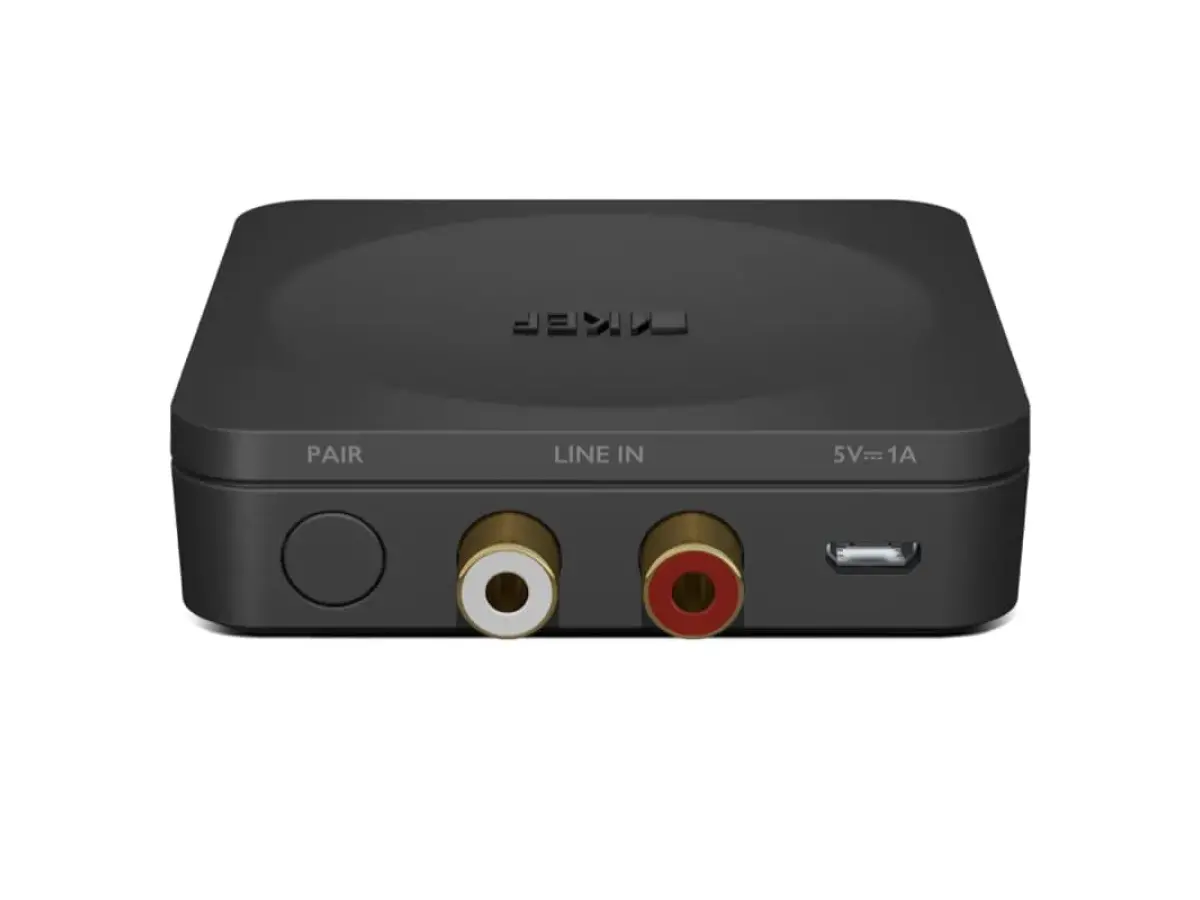 Il trasmettitore del kit si collega alla sorgente audio, come un amplificatore, un ricevitore AV o un set di diffusori attivi KEF. È dotato di ingresso LINE IN stereo, dove si consiglia di utilizzare entrambi i canali L + R anche per segnali mono; a questo scopo KEF include un adattatore per cavi singoli. Il pulsante PAIR permette di associare il trasmettitore al ricevitore o di ripristinare l’accoppiamento in caso di problemi, mentre un LED indica lo stato dell’associazione.