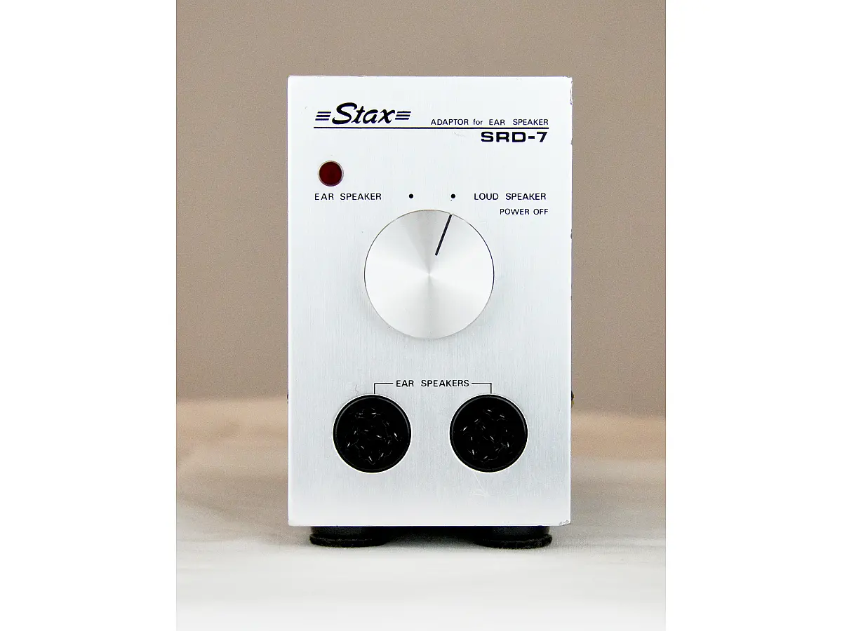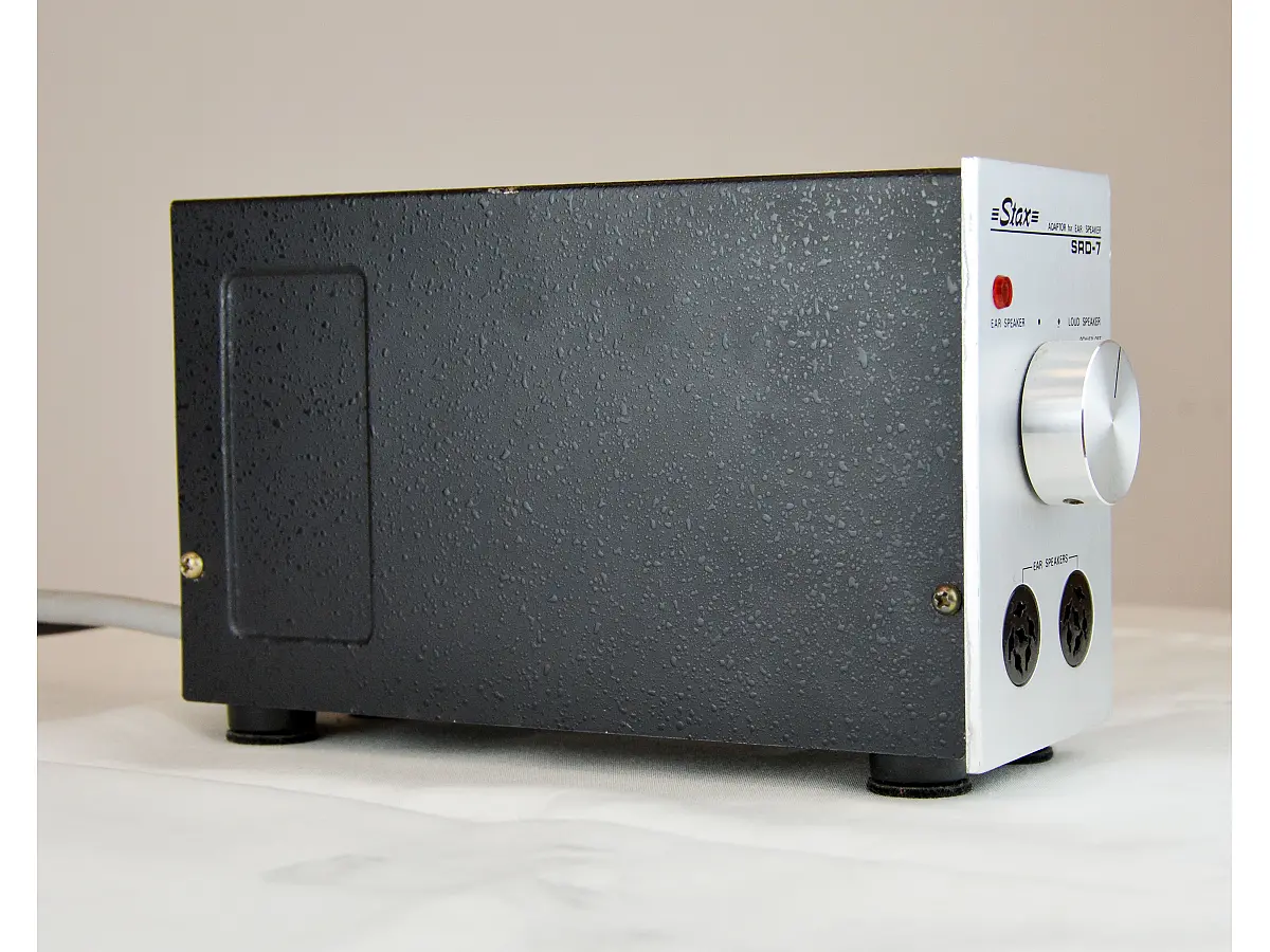 Il modello SRD-7 in versione “normal bias” dispone di due uscite per cuffie con connettori Stax a 6 pin, compatibili con la maggior parte delle cuffie Stax vintage. La versione “pro-bias” invece supporta cuffie ad alta tensione della serie Pro. L’unità, di dimensioni compatte (circa 12 x 7 x 20 cm), si posiziona comodamente accanto a un computer o in spazi ridotti. Sul pannello frontale è presente una manopola di accensione e spegnimento, che consente di passare facilmente dal setup per cuffie a quello per diffusori, instradando il segnale dell’amplificatore agli altoparlanti quando le cuffie non sono in uso.