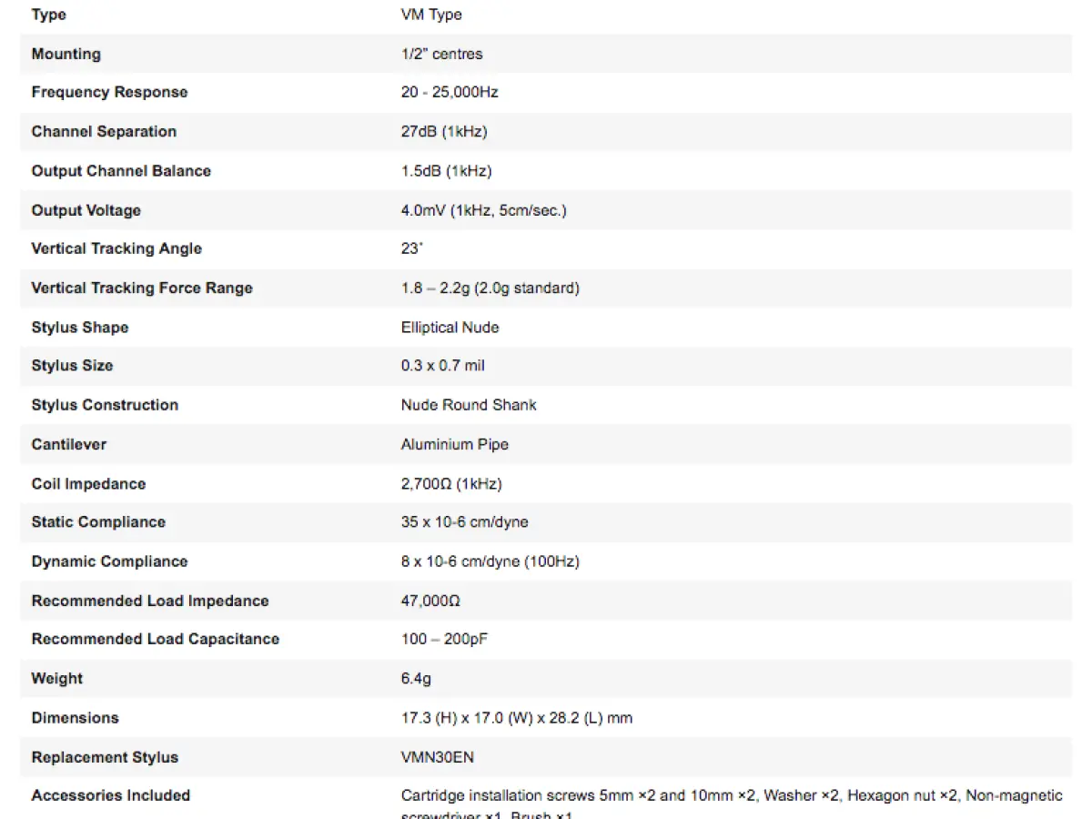 La VM530EN è dotata di due magneti accoppiati ai canali sinistro e destro per un’eccezionale separazione dei canali e una risposta in frequenza estesa. Lo stilo ellittico nudo da 0,3 x 0,7 mil dona leggerezza alla cartuccia e riduce le vibrazioni durante l’esecuzione, consentendo una riproduzione più completa della frequenza e una minore distorsione di tracciamento rispetto a uno stilo bounded. Include hardware di montaggio.