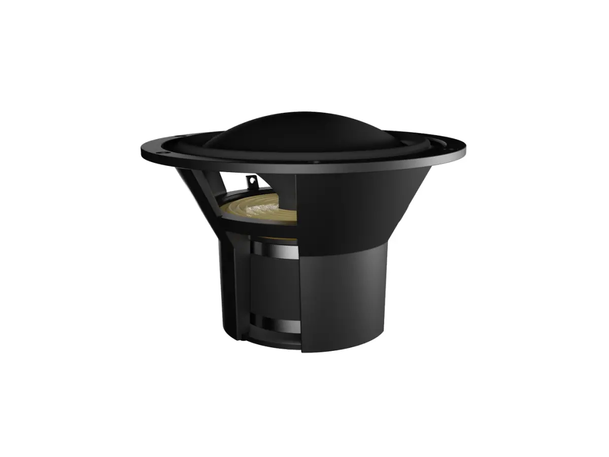 Il midrange XM1 da 5 pollici, caricato in tromba sferica da 500 mm, copre la gamma 290 Hz–4000 Hz, con diaframma a cupola Soft-Mesh-Compound che riduce risonanze e distorsioni. La combinazione con tecnologia AirGate, chassis SingleFrame e potenti magneti InnerCore permette escursioni lineari e un’efficienza di 107 dB/W. Il crossover integra soluzioni avanzate come SphericLowCut e AirGate, con filtri passivi minimizzati e componenti proprietari NatureCap costruiti a mano in Germania, assicurando filtraggio preciso, protezione dei driver e qualità timbrica superiore.