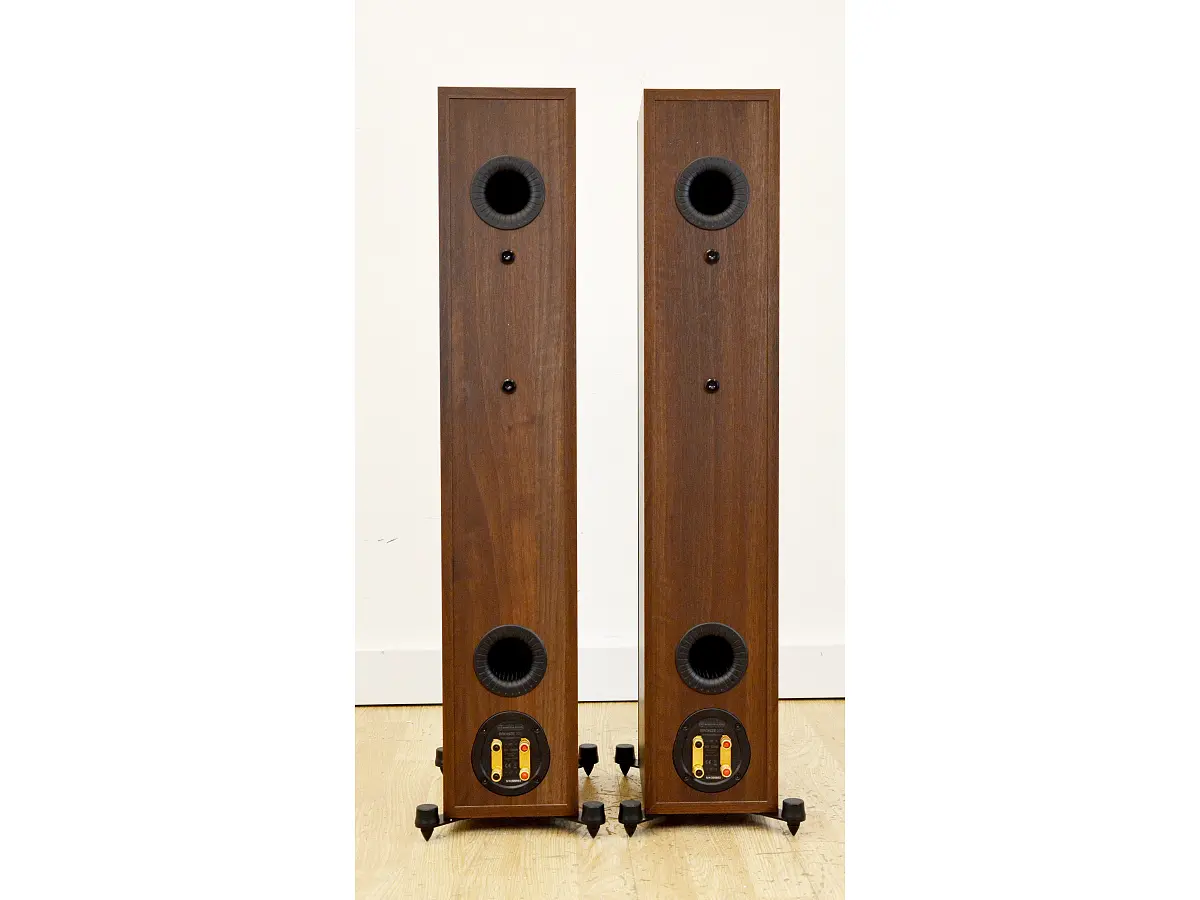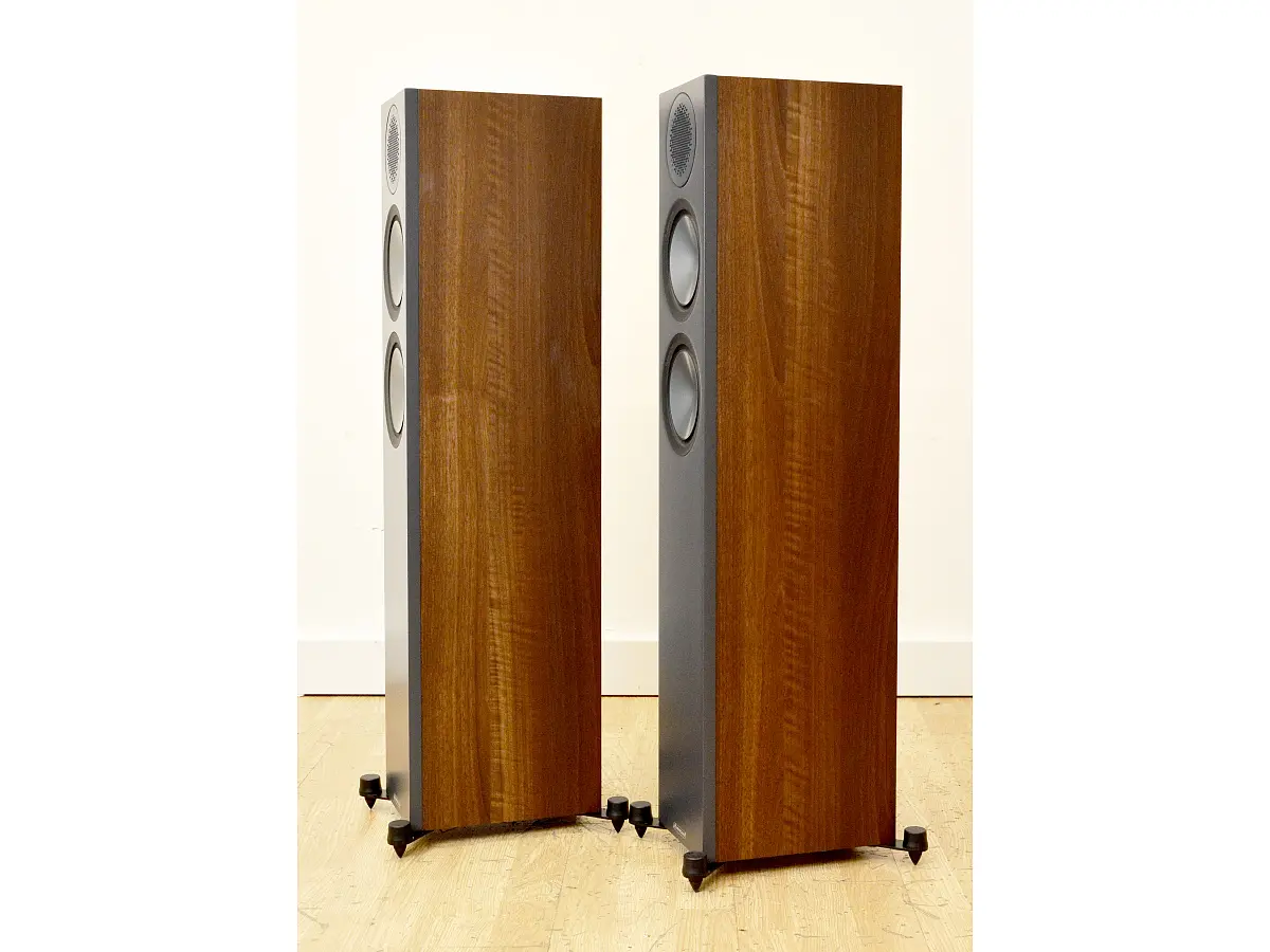 Dal punto di vista costruttivo, le Bronze 200 poggiano su solide basi esterne in acciaio che assicurano stabilità e isolamento, sia su pavimenti duri sia su tappeti, grazie ai piedini e alle punte dedicate. L’altezza di circa 90 cm contribuisce a un corretto allineamento acustico e rafforza la sensazione di eleganza e proporzione.