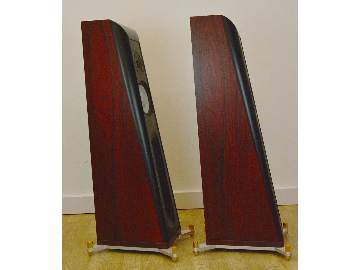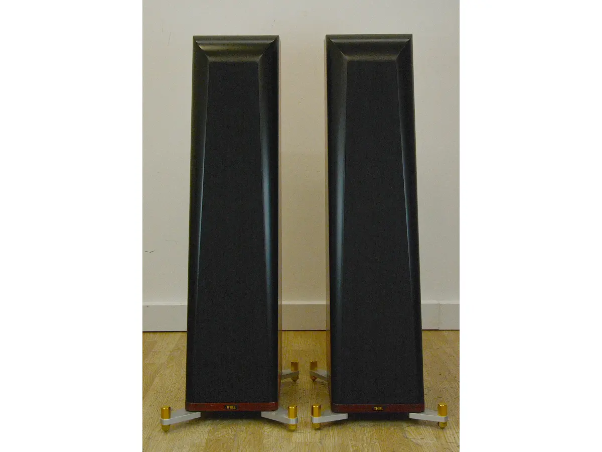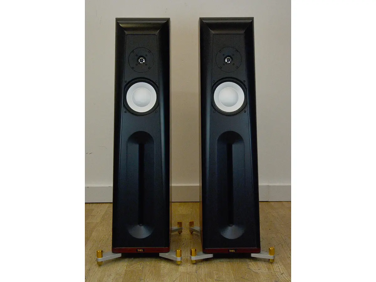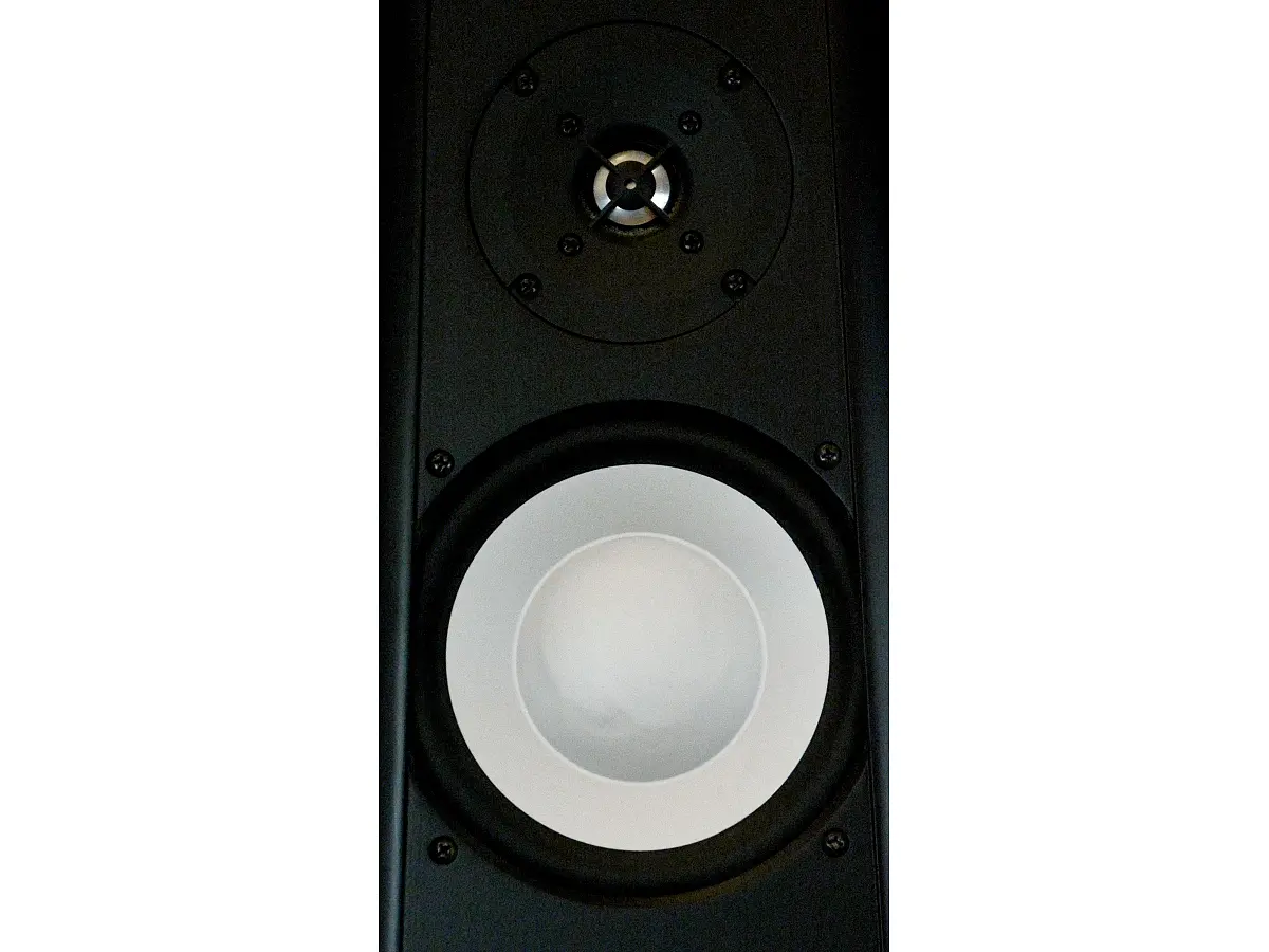 Il woofer da 6,5 pollici, interamente progettato e prodotto da Thiel, utilizza una bobina mobile da 3 pollici capace di muovere il cono metallico più vicino al suo bordo rispetto ai modelli convenzionali. Questa configurazione aumenta la rigidità del cono, spostando le risonanze indesiderate verso frequenze più alte e garantendo una riproduzione più pulita e precisa. Il magnete al neodimio è collocato all’interno del supporto della bobina, soluzione che ne assicura la schermatura. Il tweeter da 1 pollice, anch’esso con cupola metallica, adotta una bobina corta con anello in rame per la riduzione della distorsione, operando in un ampio traferro. La cupola è leggermente incassata in una piastra frontale con una svasatura che ne aumenta la sensibilità sull’asse principale, in equilibrio con quella del woofer, pur limitando leggermente la dispersione nelle frequenze più alte.