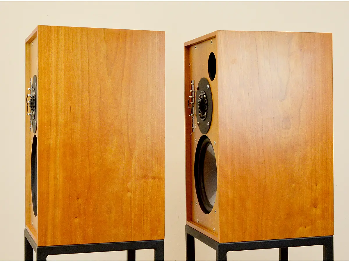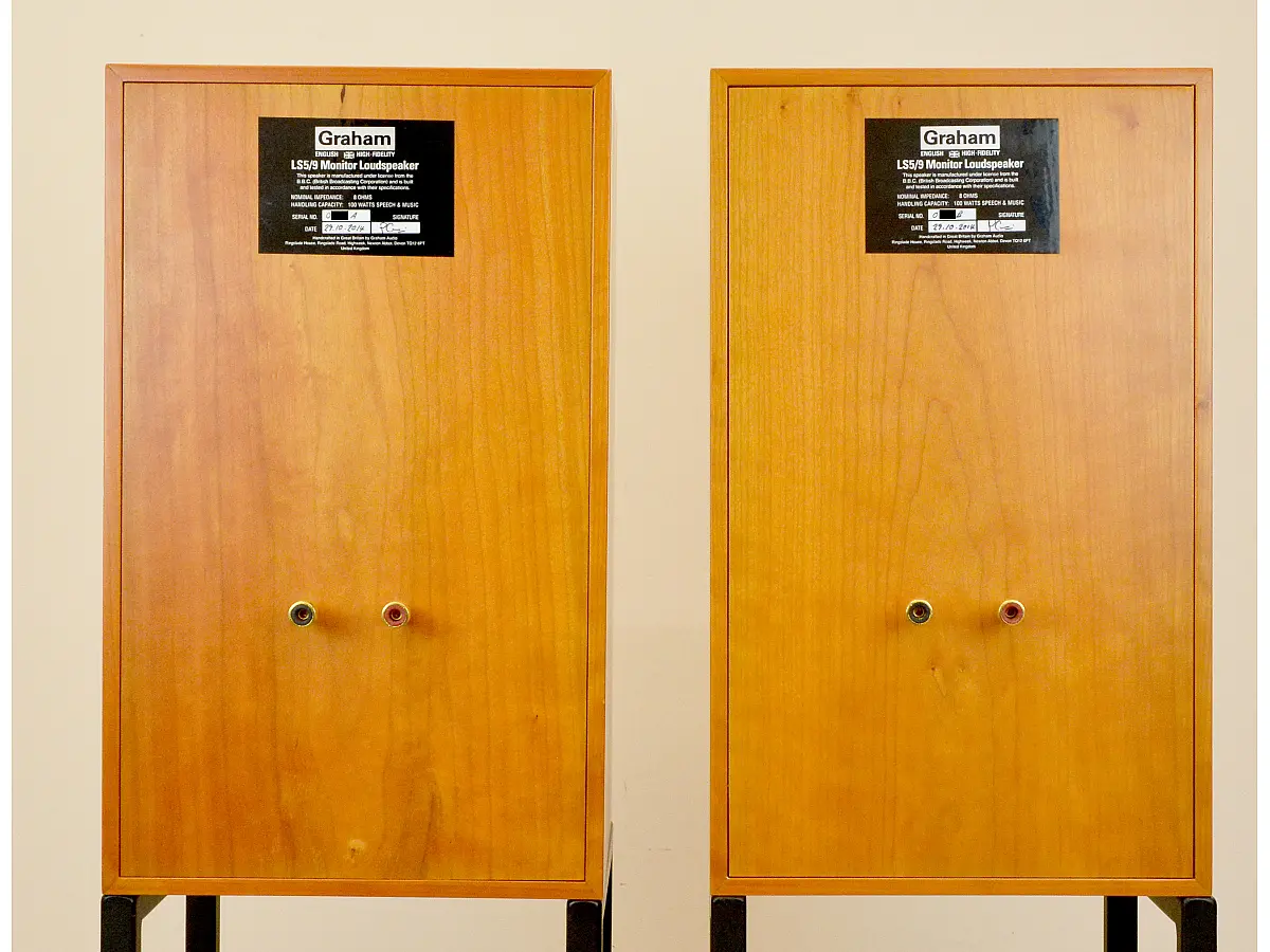 Il cabinet adotta la classica costruzione BBC “thin-wall”, realizzata nel Regno Unito con compensato di betulla da 9 mm di alta qualità, scelta per la sua capacità di spostare le risonanze lontano dalla regione critica della gamma media. Le pareti leggere ma opportunamente smorzate, unite allo smorzamento interno in lana di roccia, contribuiscono a una riproduzione naturale, ariosa e priva di colorazioni indesiderate. Le impiallacciature in vero legno sono applicate e rifinite a mano secondo standard elevati, conferendo al diffusore un aspetto elegante e discreto, mentre la griglia frontale, ricavata da un unico pannello di compensato e fissata tramite magneti nascosti, mantiene intatta l’estetica pulita del progetto.