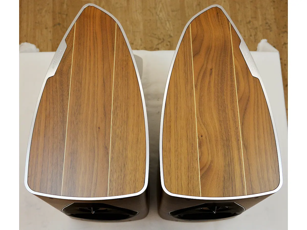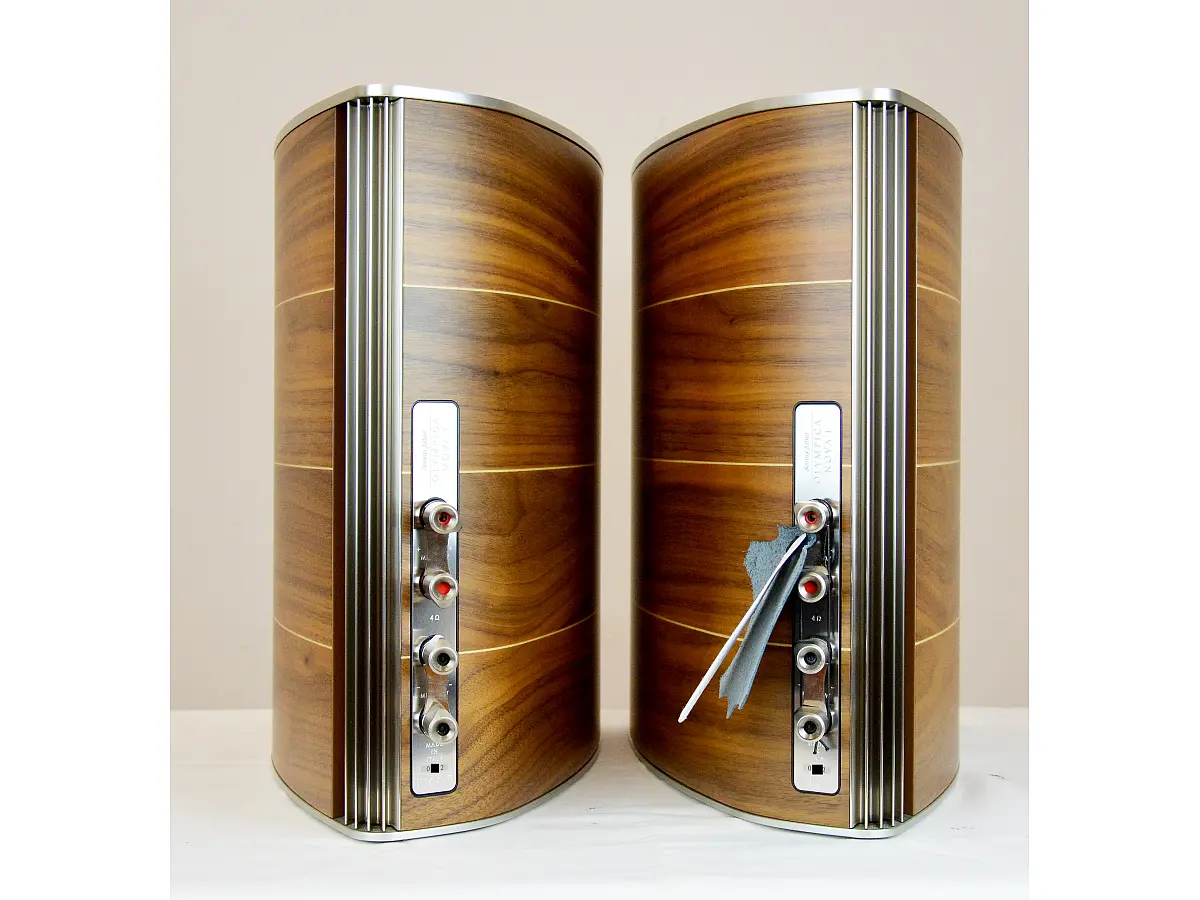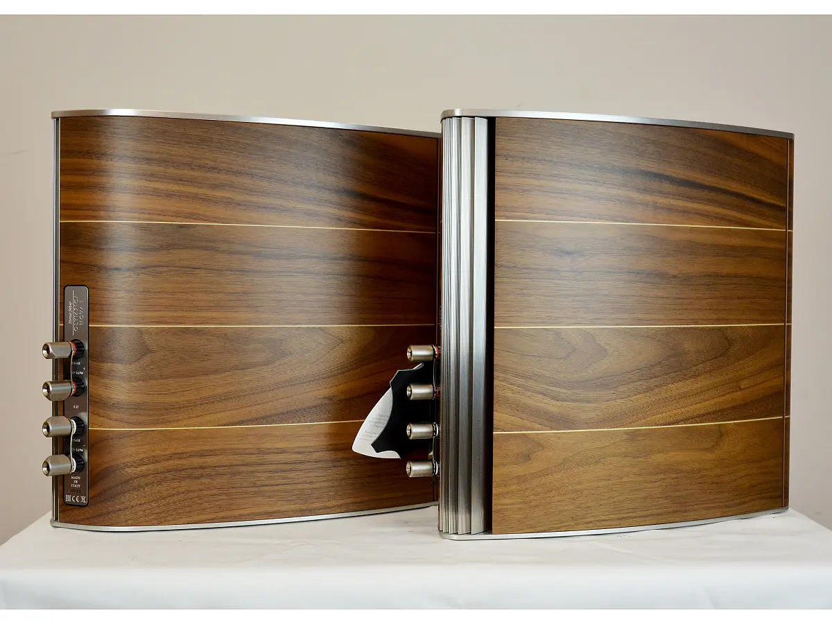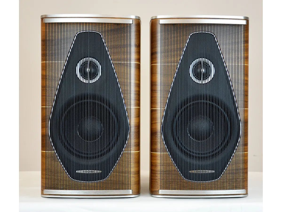Il cabinet del diffusore è una vera e propria opera d'arte, con una forma asimmetrica e rigida ispirata al design del liuto. La struttura è composta da otto strati di legno curvato, rinforzato internamente per garantire una rigidità superiore. Questo design riduce al minimo le vibrazioni e elimina le risonanze indesiderate, assicurando che solo il suono puro arrivi all’ascoltatore. I diffusori sono progettati per consentire un posizionamento flessibile, permettendo agli utenti di invertire la coppia di diffusori per scegliere la configurazione ottimale in base all'ambiente di ascolto.