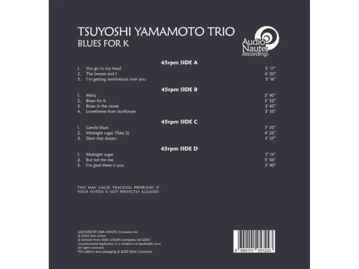 Il Tsuyoshi Yamamoto Trio offre una performance emozionante con Blues For K, che mette in mostra la loro straordinaria sinergia musicale. Guidato dal virtuoso pianista Tsuyoshi Yamamoto, il trio incanta con interpretazioni jazz raffinate in diversi sottogeneri. I brani emanano un’eleganza senza tempo, combinando sofisticazione melodica e finezza ritmica. Ogni nota è carica di emozione, trasportando l’ascoltatore in un regno di pura estasi musicale, supportata da tecnica impeccabile e interpretazione sentita. Con questa registrazione, il Tsuyoshi Yamamoto Trio lascia un’impronta indelebile negli appassionati di jazz.