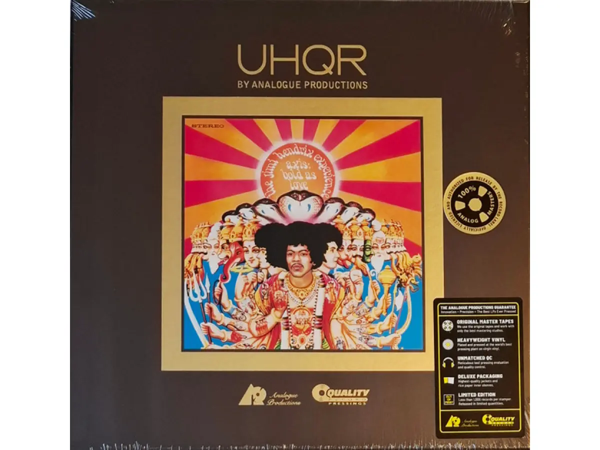 La Analogue Productions è orgogliosa di riproporre il suo primo titolo pubblicato su UHQR – Axis: Bold as Love, capolavoro di Jimi Hendrix uscito per la prima volta nel 1967 – in una nuova riedizione su doppio LP da 200 grammi a 45 giri, in versione sia stereo sia mono. Questa riedizione su UHQR è stata accuratamente rimasterizzata a partire dai nastri analogici originali da Bernie Grundman, uno dei più grandi e acclamati ingegneri del suono specializzati in questo campo. Ogni UHQR è stato poi stampato presso la Quality Record Pressings, l’azienda leader nel mondo nella produzione di vinili audiophile di proprietà della Acoustic Sounds, usando l’esclusivo Clarity Vinyl selezionato a mano e prestando al massima attenzione anche ai più piccoli dettagli. Questi LP da 200 grammi presentano lo stesso profilo piatto che ha contribuito a garantire il successo planetario di questo supporto tra gli audiofili di tutto il mondo. Dal solco di ingresso a quello di uscita, il profilo del disco non presenta alcuna inclinazione, consentendo alla puntina del giradischi di riprodurre le informazioni sonore rimanendo perfettamente perpendicolare ai solchi, dal bordo al centro. Il Clarity Vinyl permette di realizzare una stampa dell’album assolutamente allo stato dell’arte, una eccezionale qualità sonora che va a braccetto con una presentazione grafica apprezzabile sotto tutti i punti di vista. Dopo la stampa, ogni UHQR viene accuratamente ispezionato a mano e solo i dischi assolutamente perfetti vengono immessi sul mercato. Ogni titolo viene presentata in una lussuosa confezione a conchiglia e comprende al suo interno un booklet nel quale viene spiegato dettagliatamente ogni passaggio che porta alla produzione di un UHQR e un certificato di controllo firmato a mano, che contribuiscono a renderlo un articolo di lusso e un oggetto di culto per gli audiofili più esigenti del mondo.