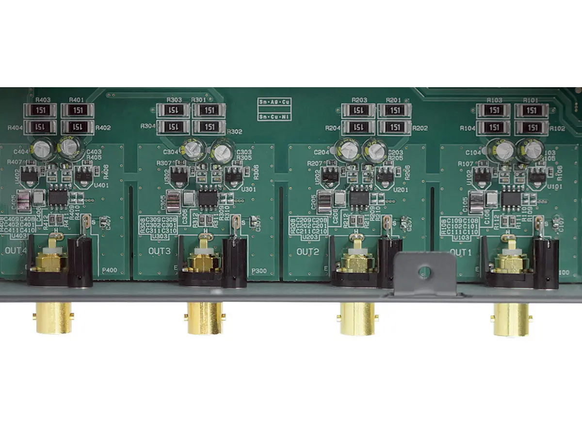 Ogni dettaglio del circuito è stato progettato per massimizzare la purezza del segnale. I quattro connettori di uscita BNC placcati in oro, ciascuno con il proprio circuito buffer isolato, permettono di collegare fino a quattro dispositivi contemporaneamente senza interferenze o degrado del segnale. L’alimentazione, basata su un trasformatore toroidale ad alta capacità, garantisce una corrente costante e stabile, essenziale per la generazione del clock e per mantenere l’uscita ad altissima precisione. In questa versione “X”, il circuito dell’amplificatore buffer e l’alimentazione sono stati ulteriormente raffinati, innalzando ulteriormente il livello qualitativo del suono.
