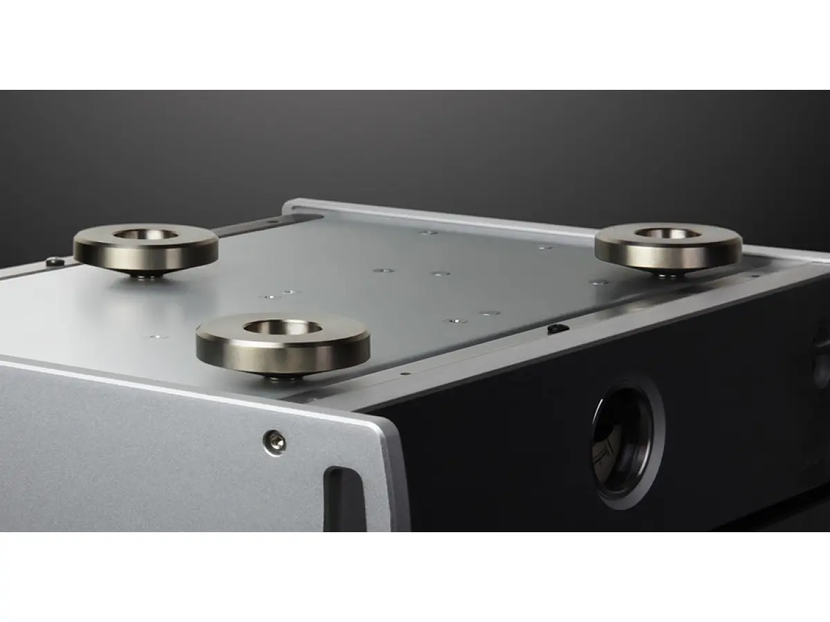 Il design del CG-10M-X riflette la cura artigianale e l’eleganza tipiche della serie TEAC Reference: il pannello superiore in alluminio adotta una struttura semi-galleggiante, priva di viti a vista, che contribuisce a un suono più aperto, naturale e arioso. L’apparecchio poggia su tre piedini conici Stressless Foot, studiati per isolare le vibrazioni e assicurare una stabilità ottimale anche su superfici lievemente irregolari. Questa soluzione meccanica consente al dispositivo di vibrare liberamente, migliorando l’immagine sonora e restituendo un timbro più ricco e realistico.
