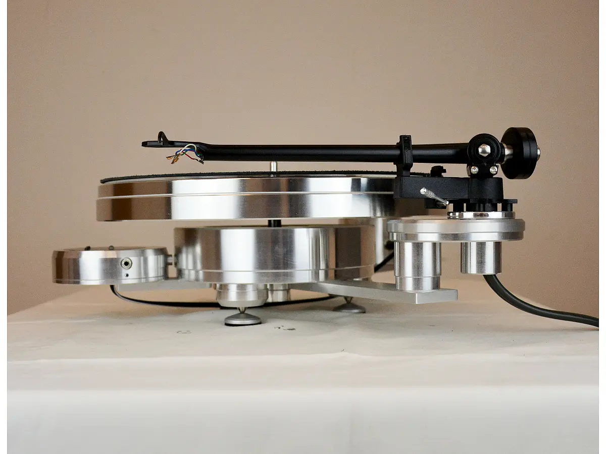 La struttura del giradischi viene inoltre ripensata in chiave funzionale, con l’integrazione del motore e del sistema di controllo in un unico alloggiamento. Questa scelta libera spazio attorno al piatto, che risulta anche più spesso rispetto alla versione precedente, e consente un’elevata flessibilità nell’installazione dei bracci, arrivando a supportare fino a tre unità anche in configurazione da 12 pollici. La progettazione tiene conto anche della massima precisione negli accessori di montaggio, con soluzioni studiate per garantire compatibilità e stabilità meccanica, incluso un anello di supporto dimensionato con grande accuratezza.