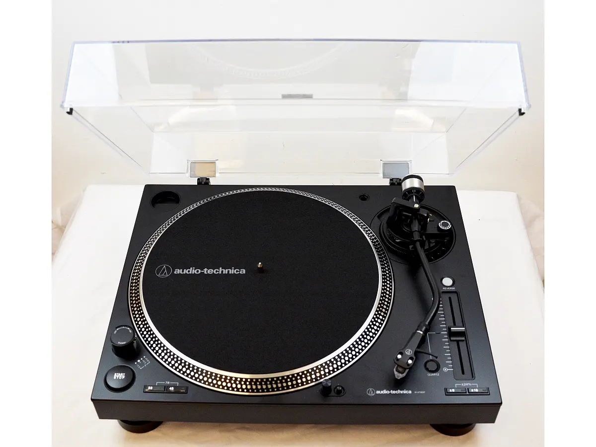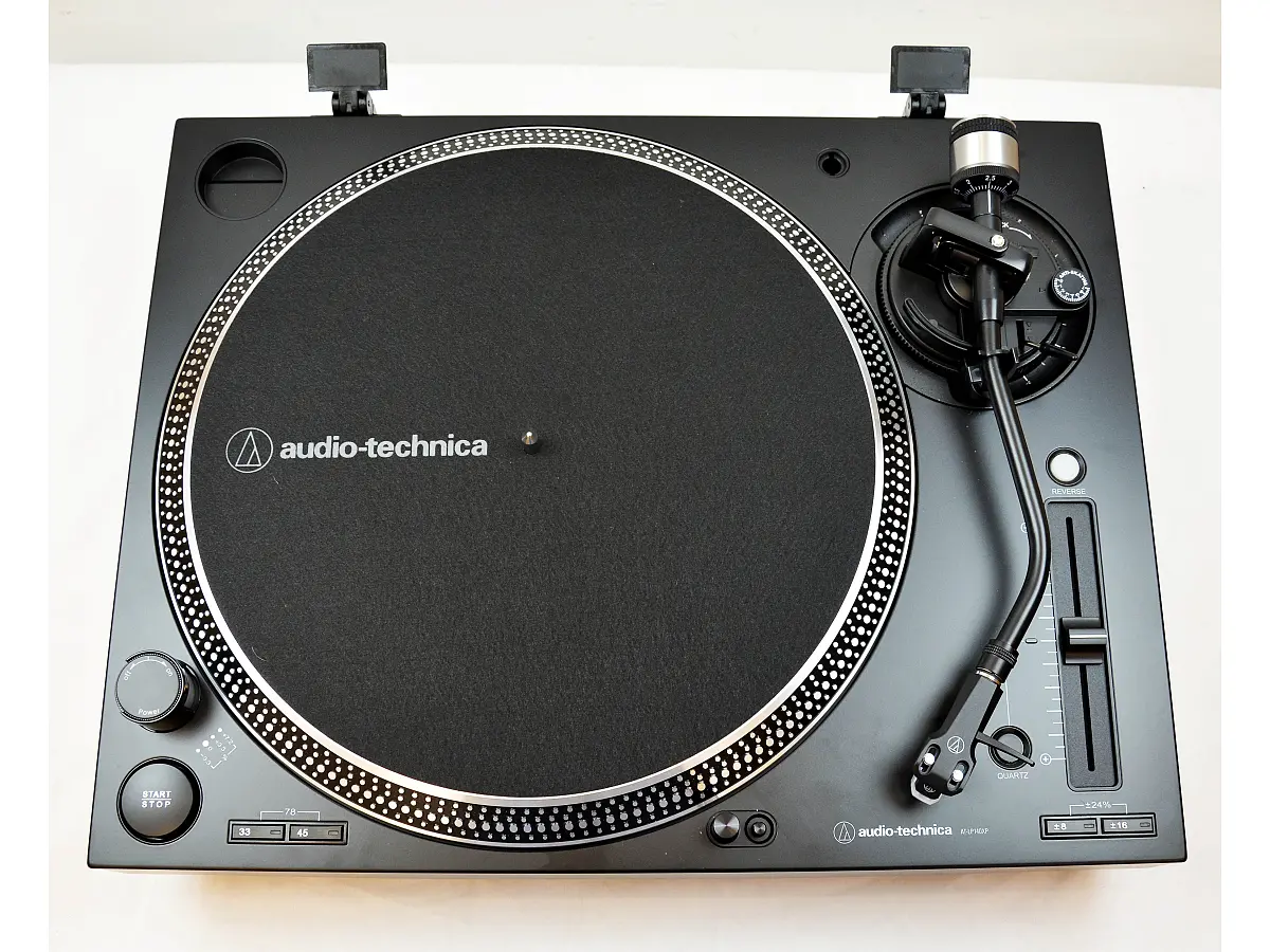 L’AT-LP140XP integra funzioni professionali come il pulsante start/stop, la possibilità di riproduzione avanti e indietro, il controllo di variazione del pitch con blocco al quarzo e tre intervalli di regolazione (+/-8%, +/-16%, +/-24%), oltre a un piatto stroboscopico con indicatore di velocità e una luce di puntamento popup per facilitare il cueing in ambienti poco illuminati. La base smorzata riduce efficacemente il feedback a bassa frequenza, mentre la copertura antipolvere incernierata, rimovibile, protegge il giradischi quando non è in uso.