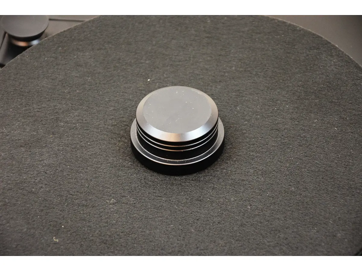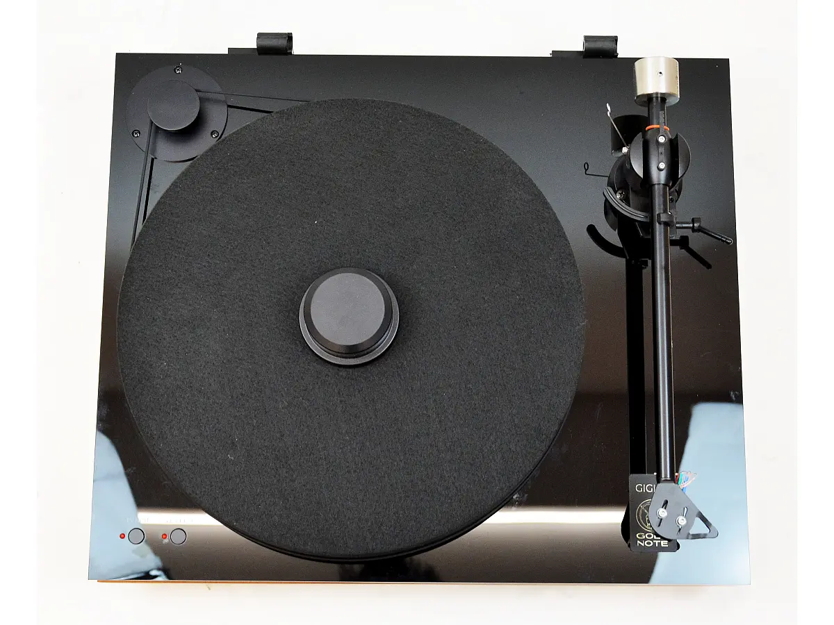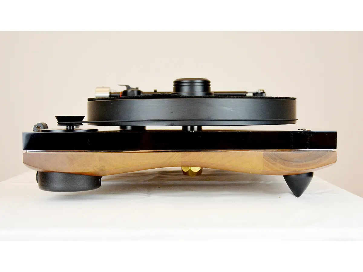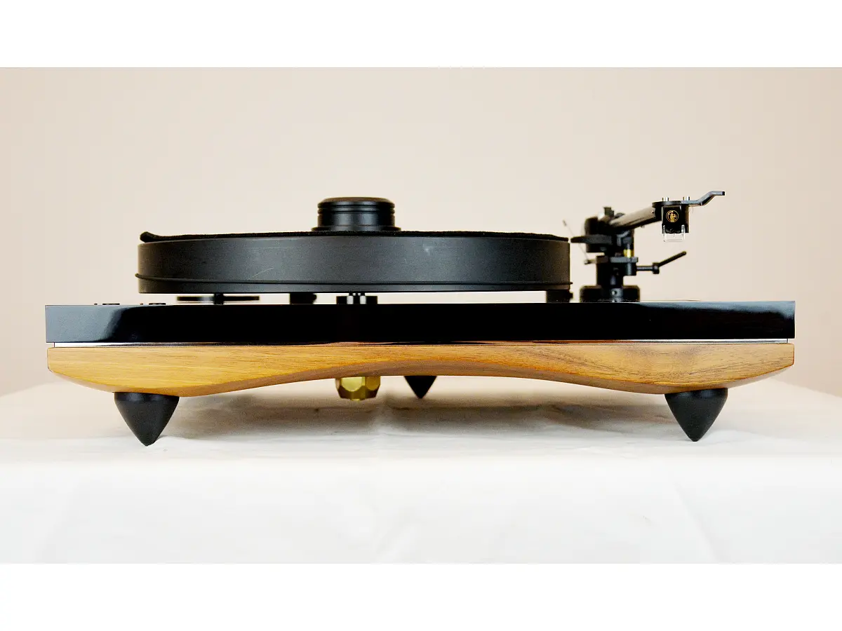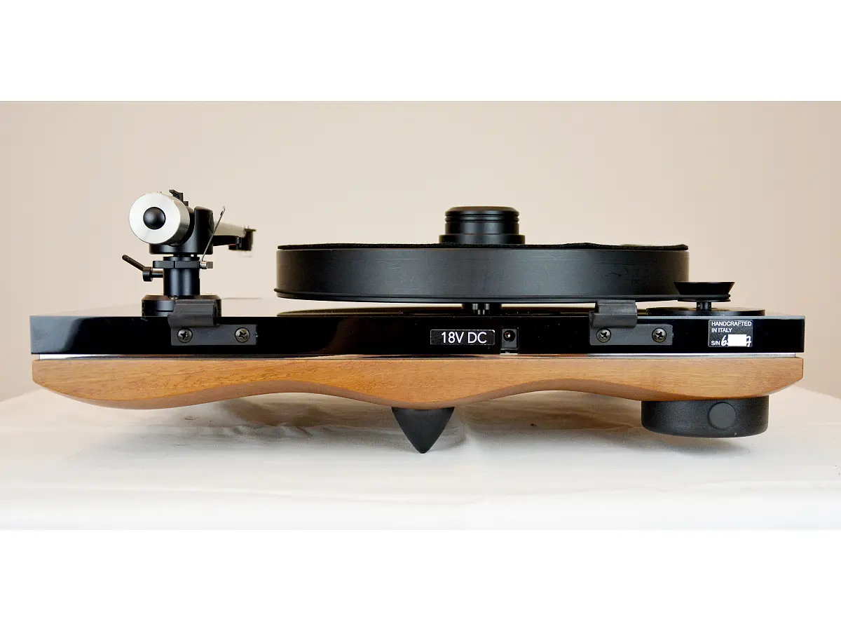 Il piatto da 33 mm in POM ad alta densità è progettato per una rotazione ultra precisa, abbinato a un sistema perno/pozzetto in bronzo e acciaio al cromo rettificato e lappato, incassato nella base in metacrilato per ridurre al minimo turbolenze e interferenze meccaniche. La puleggia a forma di clessidra mantiene costante il movimento della cinghia, riducendo Wow & Flutter e rumble, mentre il motore sincrono a 12 Volt, sviluppato appositamente, garantisce coppia elevata e vibrazioni praticamente assenti. L’alimentazione è gestita da un sistema elettronico proprietario basato su un micro-processore Quadral-Core, che filtra e ricostruisce l’onda elettrica con precisione, assicurando stabilità della velocità a 33⅓ e 45 rpm e memorizzando i parametri impostati.