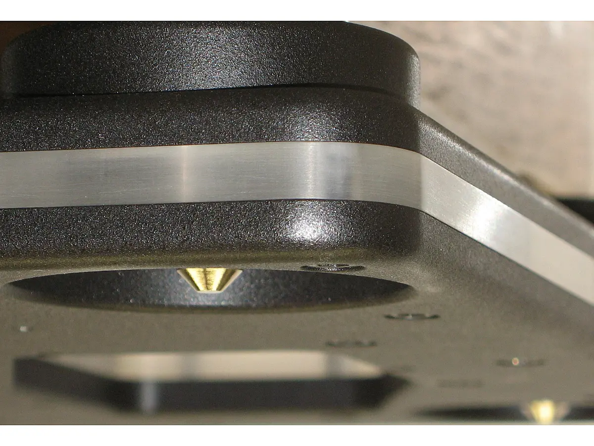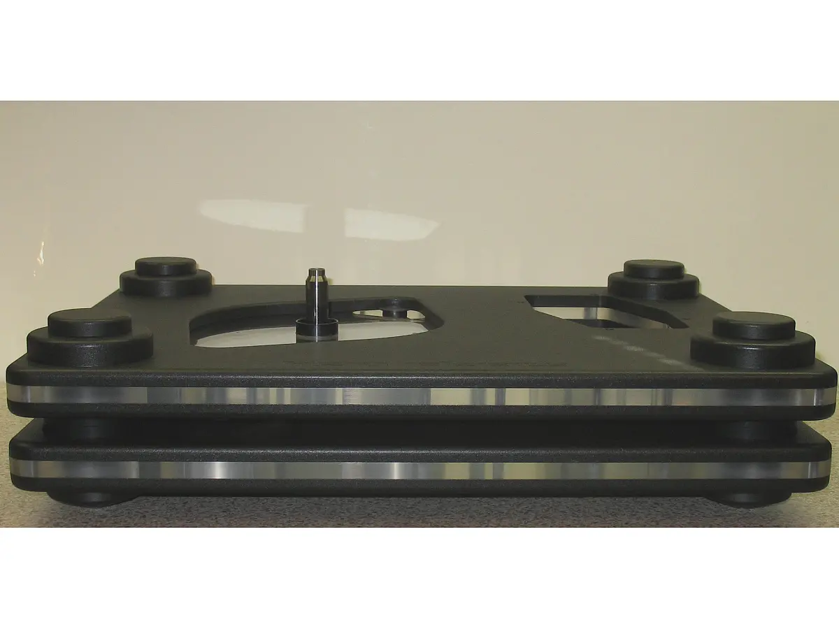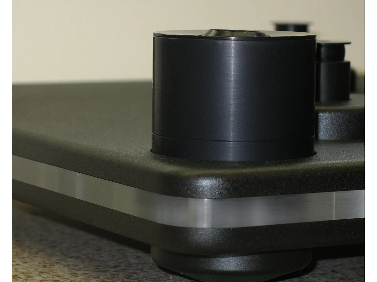 La struttura del Reference 2 è basata su due basi distinte, realizzate con la tipica costruzione a sandwich di alluminio e acrilico, rigidamente unite da viti in acciaio inox non magnetico precaricate. Questa combinazione consente di coniugare la rigidità del metallo con le proprietà smorzanti dell’acrilico, garantendo un’eccellente neutralità meccanica. La base superiore, su cui poggia il piatto e il braccio, è sospesa tramite grandi molle immerse in olio di silicone, capaci di isolare perfettamente il sistema da vibrazioni e risonanze esterne, operando a una frequenza di risonanza estremamente bassa. La base inferiore, invece, è sostenuta da tre punte coniche in alluminio e acciaio inossidabile, assicurando un appoggio stabile e perfettamente bilanciato.