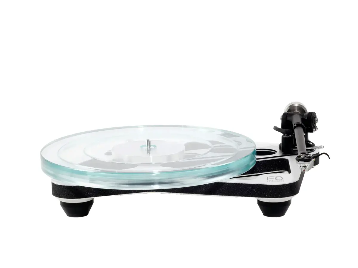 Il Planar 8 utilizza un piatto con tre lamine di vetro che è il risultato della collaborazione con una ditta inglese specialista nella tecnologia del vetro. Questo nuovissimo piatto è costituito da due diversi vetri Pilkington di alta qualità. Come regola generale l’unica parte di un giradischi che richieda un’alta massa è il piatto così da ottenere una velocità di rotazione costante. D’altro canto un piatto pesante crea maggiori problematiche per il mozzo di rotazione, così, ancora una volta, un compromesso ideale è la migliore soluzione. In pratica questo significa che la maggior parte della massa sia posta verso l’esterno del piatto in vetro così da creare un effetto volano mantenendo l’interno del piatto il più leggero possibile senza sacrificare la rigidità.