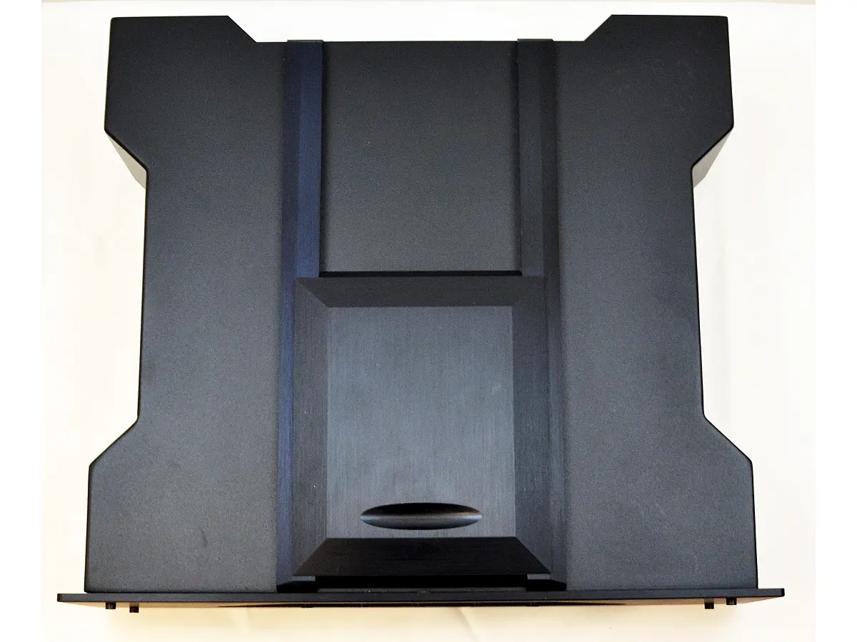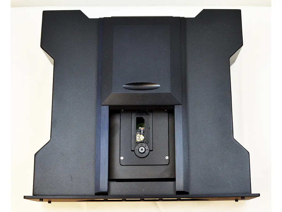 Il caricamento dall’alto rende l’inserimento del disco semplice e immediato, mentre l’ampio sportello scorrevole, solido e massiccio, conferisce un senso di robustezza e prestigio. All’interno del vano, il CD viene posizionato sul supporto dedicato e fissato tramite un clamp magnetico di peso significativo, che lo blocca saldamente al rotore del motore, garantendo stabilità e precisione durante la riproduzione.